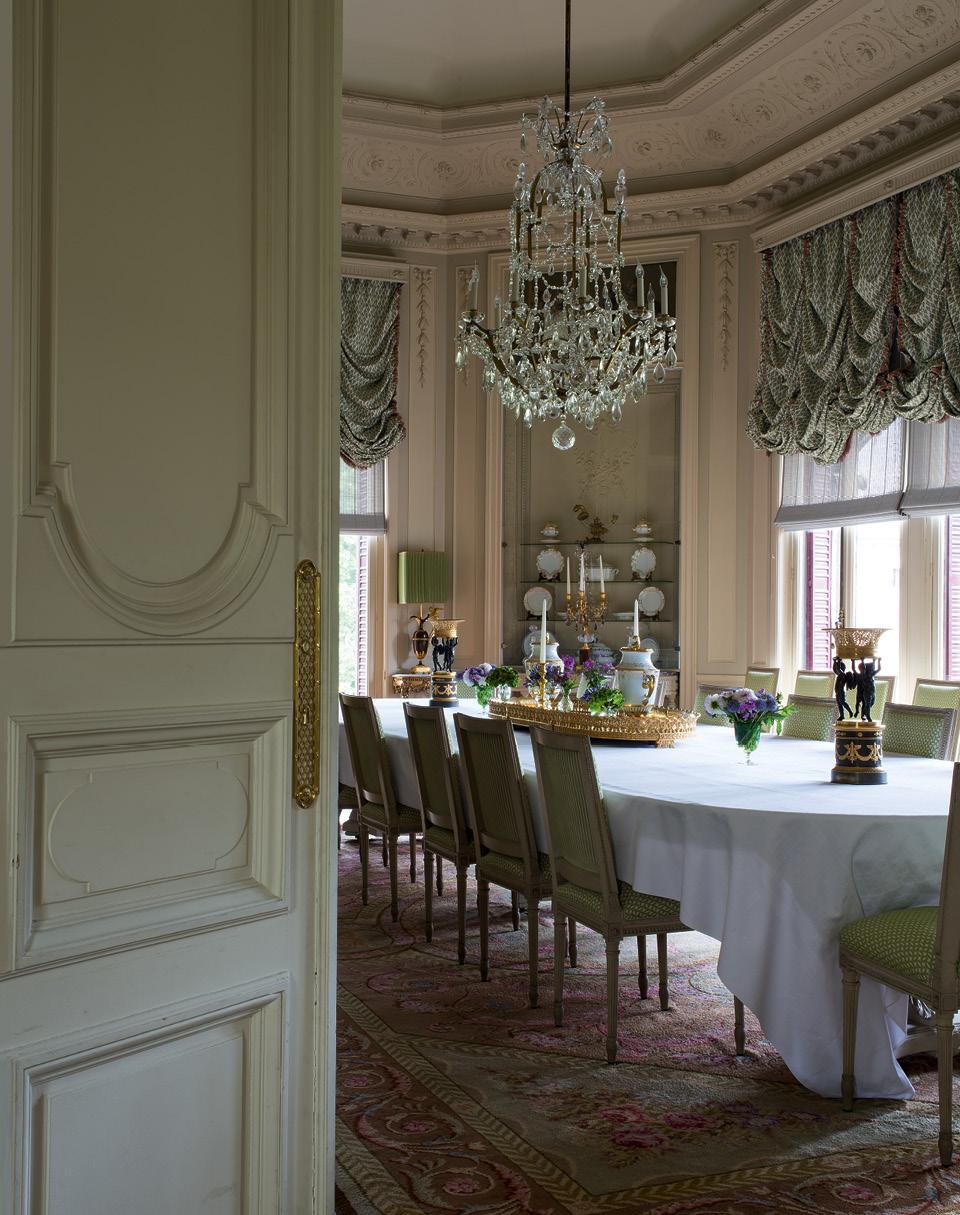 Столовая в стиле Людовика XVI появилась в замке во время реконструкции XIX века. Вся мебель здесь антикварная, ткани — Jim Thompson и Manuel Canovas.