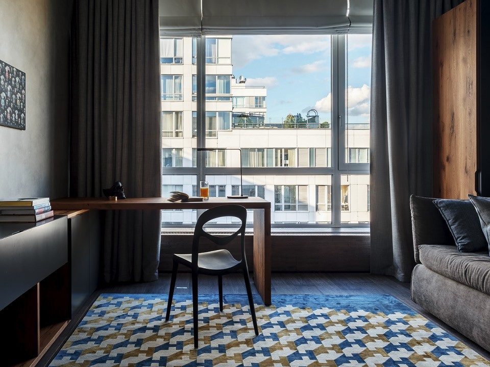 Работа двигалась быстро. Георгий и Тимур полностью изменили планировку квартиры и организовали интерьер вокруг двух встроенных объемов (внутри них находятся системы хранения и санузлы). Один такой кубик “держит” на себе общественную зону, другой — приватную часть пентхауса. Террасу архитекторы поделили на две части: 40 м² оставили под открытым небом, остальные 60 м² присоединили к квартире. Это была самая сложная часть проекта: пристройку требовалось согласовать, зрительно связать с фасадом и подвести туда все коммуникации — предполагалось, что это будет не зимний сад, которым пользуются время от времени, а полноценное жилое помещение. Так квартира получила свою самую эффектную часть — огромную столовую с панорамным остеклением. В других комнатах окна тоже большие, но до пола не дотягивают, и авторы проекта приблизили виды к хозяевам, превратив подоконники в диванчики, сидя на которых приятно смотреть на город.