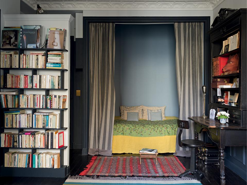 Вид из жилой зоны на зону спальни. Марианна выкрасила нишу, в которой стоит кровать, в голубой оттенок, характерный для посуды Wedgwood Blue. “Я хотела стены цвета неба, — объясняет декоратор. — Я всегда считала, что он навевает сладкие сны”.