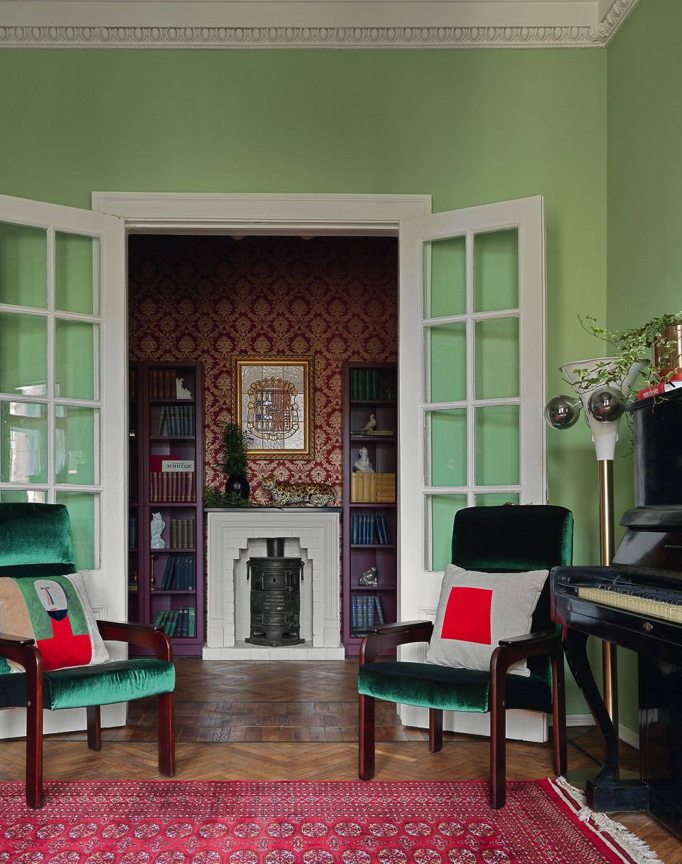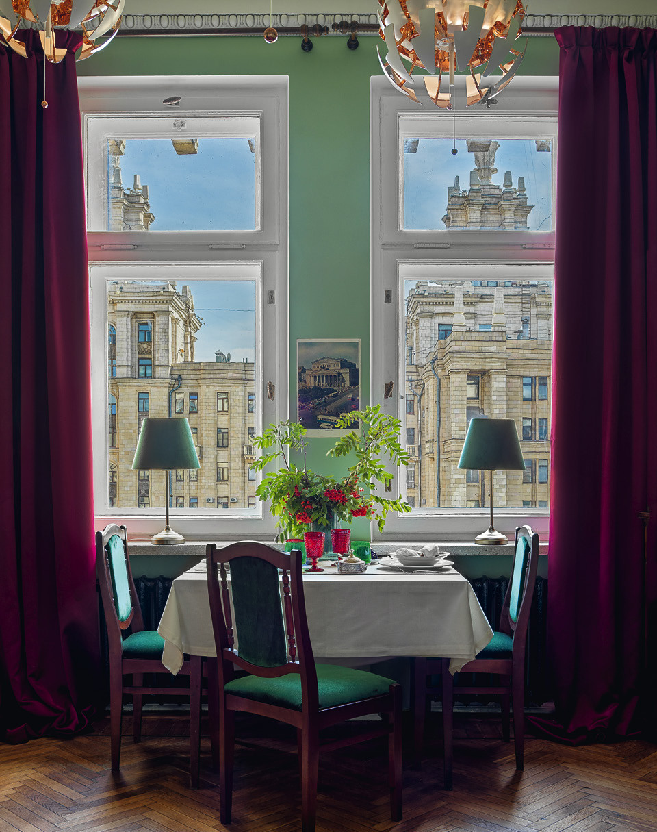 Как обходиться с советским наследием, Алена уже знает, она не первый раз воссоздает атмосферу тех времен. Дизайнер отреставрировала антиквариат, дополнила обстановку европейским винтажем, советской мебелью, найденной на Avito, и репродукциями плакатов, которые покупала на интернет-аукционах. Лепнина, двери, паркет — все осталось “родным”. Цветовую гамму интерьера Сковородникова восстанавливала по первоначальным слоям обоев и краски. В спальне и гостиной она максимально близка к оригинальной, а вот в коридоре оттенок был лососевым и не очень понравился заказчице, поэтому его заменили на более насыщенный