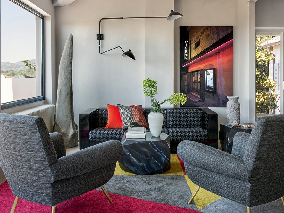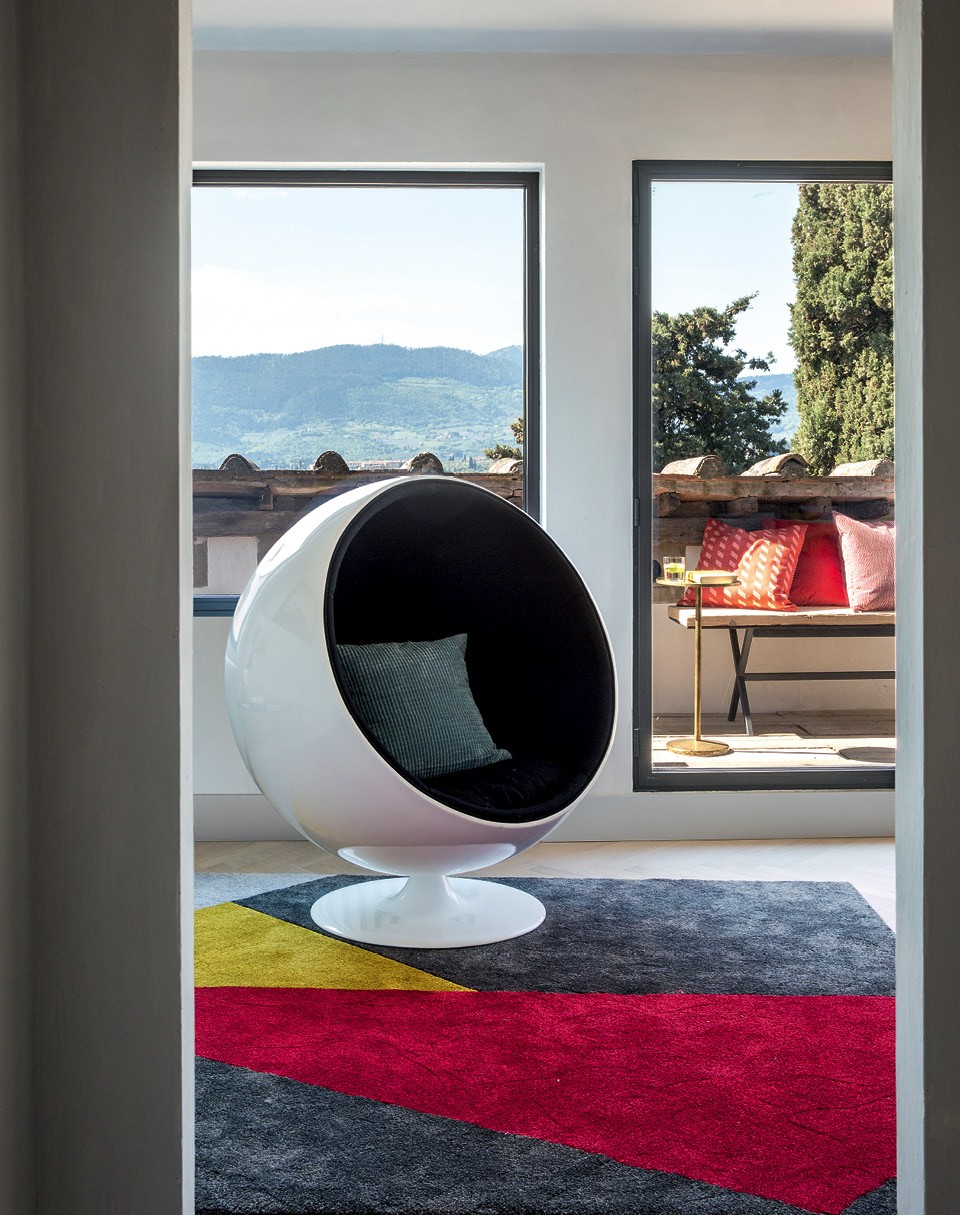 Разглядывая винтажную мебель, современное искусство и яркие дизайнерские ковры, даже не предполагаешь, что это обстановка итальянской виллы XVI века. Однако оправдание для такого веселья есть: постройка, где находится эта небольшая квартира, появилась на территории поместья Le Pozzarelle одной из последних, поэтому может считаться самой молодой. Она и внешне отличается от основных строений своей лаконичностью. Здесь подрастающее поколение семейства Кьези проводит все каникулы. В остальное время пространство тоже не пустует: хозяева регулярно сдают его в аренду. Жилье занимает первый этаж виллы, имеет отдельный вход с улицы, собственную террасу, а также выход к бассейну, которым разрешают пользоваться всем, кто здесь останавливается. Гостей также пускают погулять в большой исторический сад.