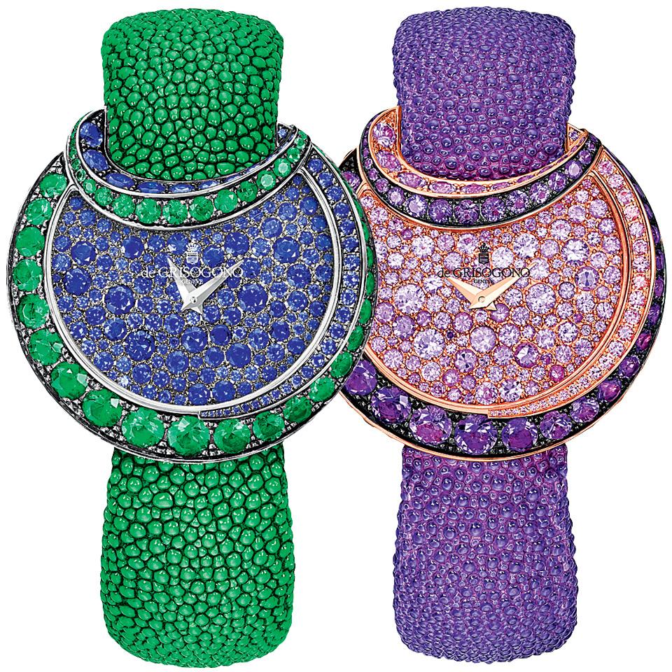 Дизайнеры марки задумали часы Luna как полноценное украшение и работали над их обликом полгода. В результате получилась модель, у которой нет ни одной прямой линии, а ремешки из кожи ската подобраны точно в тон драгоценным камням. Часы выпускаются в восьми разных вариантах расцветки. На фото модели из белого золота, изумрудов и голубых сапфиров, а также из розового золота, аметистов и розовых сапфиров.