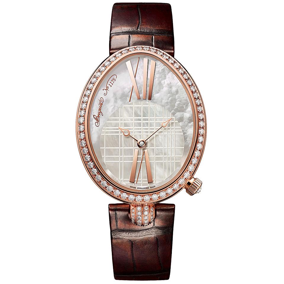 Reine de Naples Princesse 8965 — это новая версия часов, созданных по мотивам первой наручной модели, которую Абрахам-Луи Бреге сделал в 1810 году для младшей сестры Наполеона Каролины Мюрат. Циферблат из перламутра обрамляет корпус из розового золота и бриллиантов, а задняя крышка из сапфирового стекла открывает механизм с автоподзаводом 591C.