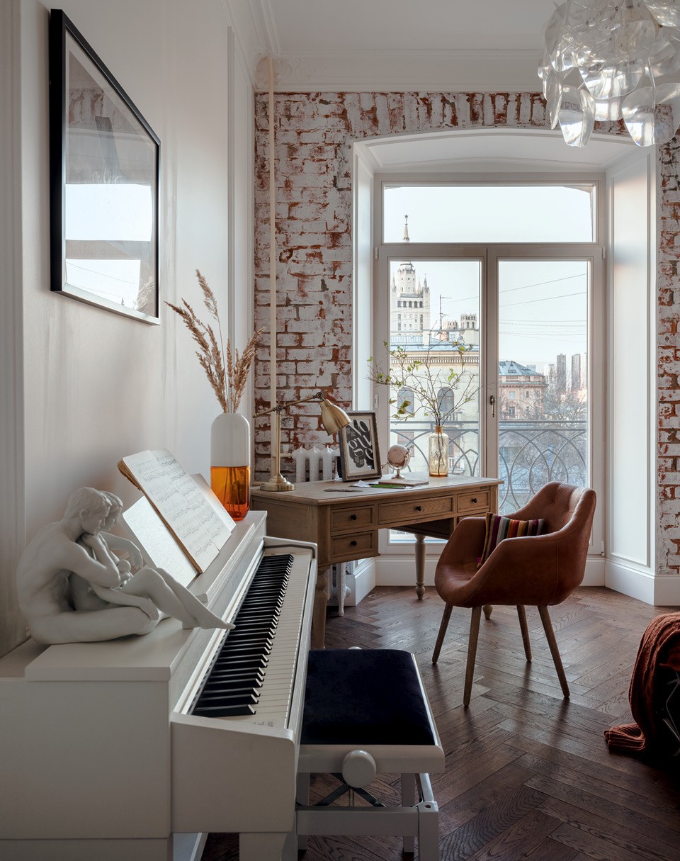 Квартира находится в дореволюционном доме в центре Москвы. Заказчица целенаправленно искала помещение с высокими потолками и большими окнами. Раньше здесь располагался офис, и, к сожалению, никаких исторических деталей в интерьере не сохранилось. Коробку полностью очистили и оставили на виду старую кирпичную кладку как единственный аутентичный элемент, а остальное создавали с нуля.