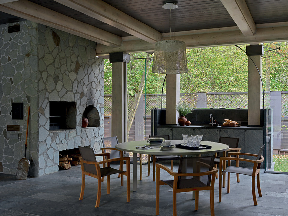 Построенный из бруса дом был не очень большим, и Камчатнова его немного реконструировала: прорезала дополнительные окна, добавила зону спа и соединила ее с основным строением через летнюю кухню. Первый этаж заняла общая зона, и игра в иллюзии начинается уже тут. Пространство разделено на каминную часть и столовую стеклянной перегородкой с зеркалом. Тина повесила с обеих сторон на зеркальное полотно картины, а на консоль поставила настольные лампы, и с первого взгляда совершенно непонятно, где заканчивается одно пространство и начинается другое. “У хозяев большая коллекция живописи, и “Ежик в тумане” Юрия Норштейна как раз и притянул зеркала”, — объясняет Тина. Ежик висит на зеркале со стороны каминной зоны и как бы намекает, что в этом пространстве все не то, чем кажется.