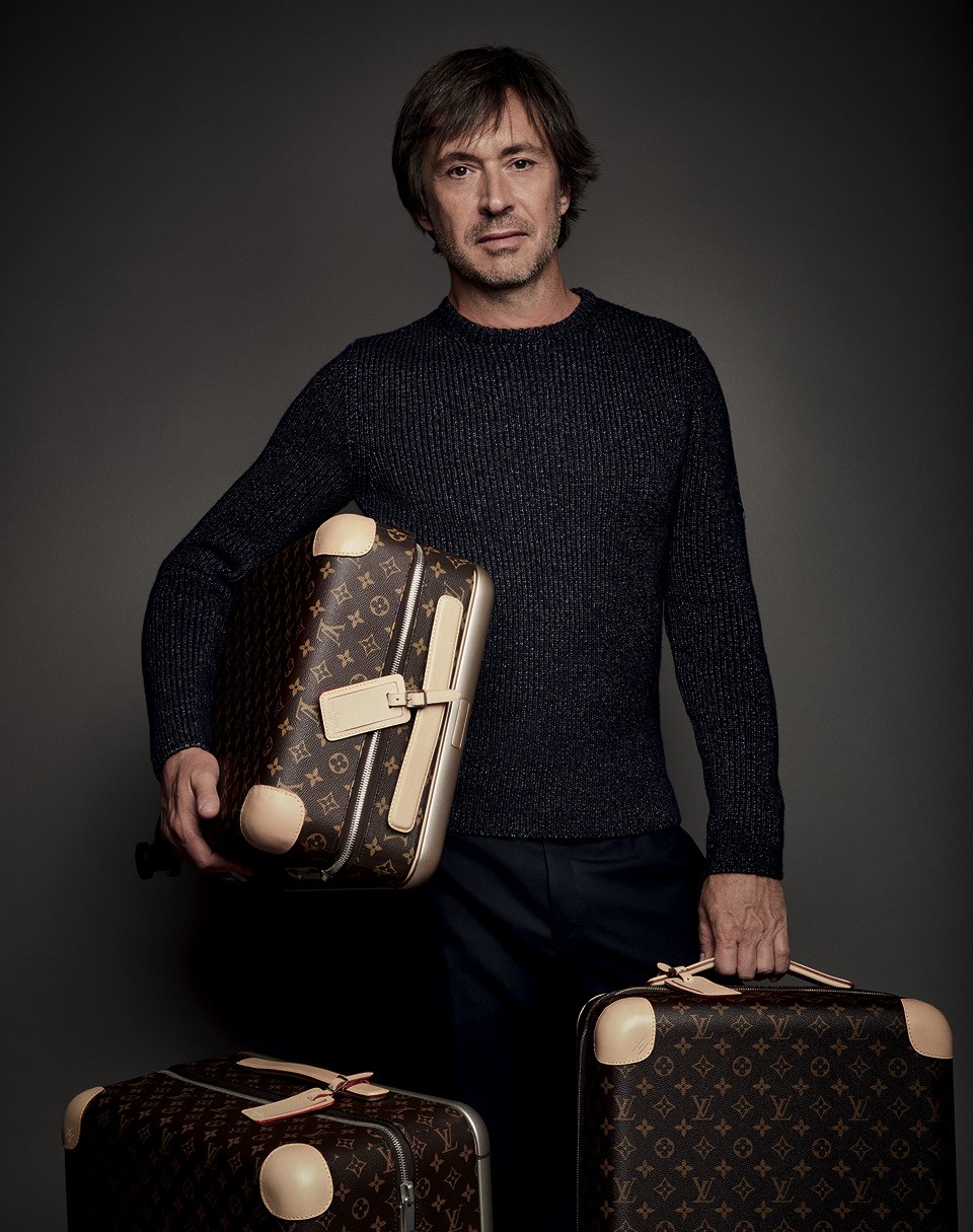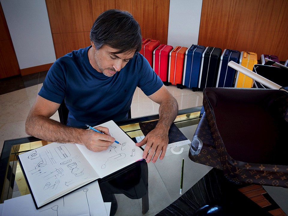 Дизайнер Марк Ньюсон с чемоданами, которые он спроектировал для Louis Vuitton в 2016 году. Они стали более вместительными за счет того, что механизм выдвижной ручки находится не внутри, а снаружи.