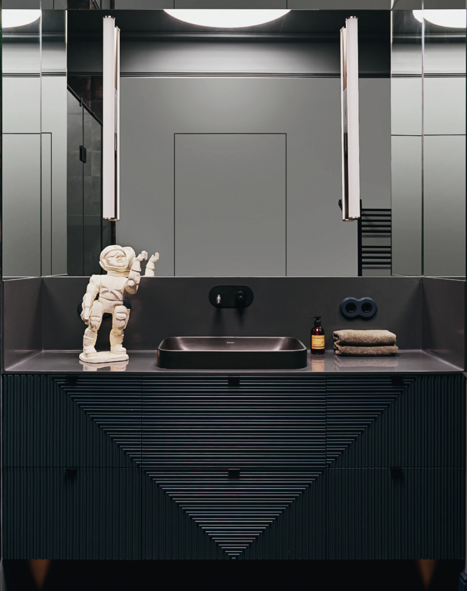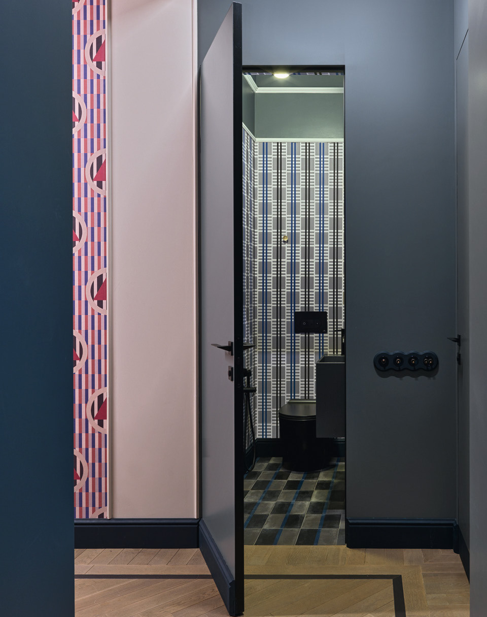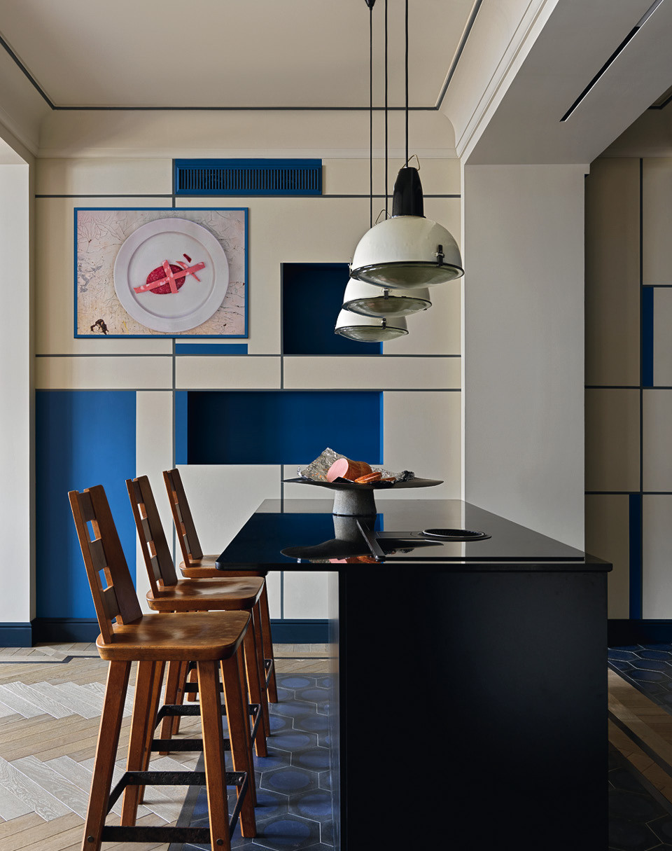 Прохор и Ольга, взяв за основу графичные рисунки Степановой, сделали четыре варианта обоев, которыми оклеили коридор, гостевой санузел и акцентные стены в спальне и кабинете. “Заказчица сама выбирала принты, которые ей нравятся. Однако напечатать обои оказалось сложнее, чем мы предполагали вначале. Небольшой фрагмент и узор в большом объеме смотрятся по-разному, поэтому мы несколько раз меняли масштаб раппорта и делали образцы разных цветов”, — вспоминает Ольга. Помимо авангардных обоев любовь хозяйки к этому направлению в искусстве отражает работа из серии “Кухонный супрематизм” арт-группы “Синие носы”, которую можно увидеть на стене рядом с кухней, а ее профессиональную связь со сферой кино — постеры плакатов братьев Стенберг. Дизайнеры отмечают, что план квартиры с цветовой раскладкой тоже вызывает ассоциации с супрематической композицией. “Почти красный коридор, синий куб кабинета, и все это пронизано черными графичными линиями”, — говорит Прохор.