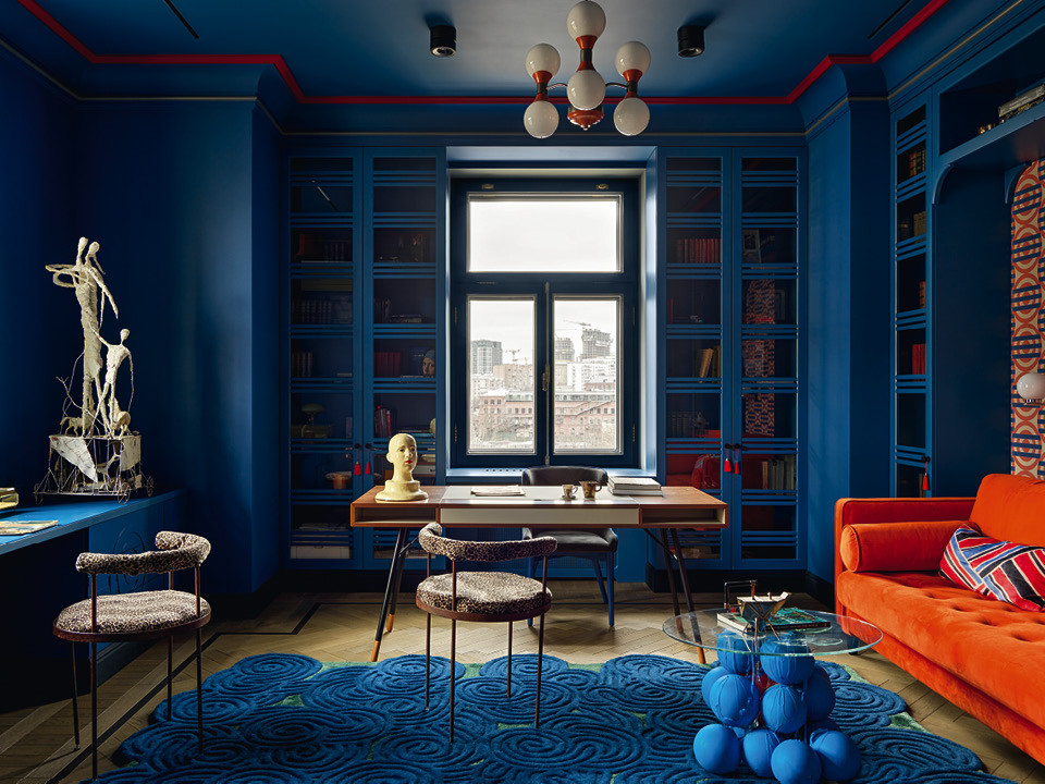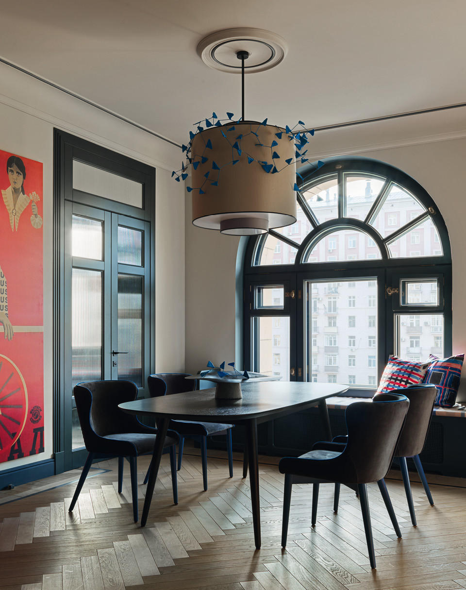 Площадь квартиры хоть и большая, сто десять квадратных метров, но оригинальная планировка сталинского дома была не очень удобной: мокрую зону с небольшой кухней отделяет несущая стена. Повезло, что предыдущий владелец успел согласовать в ней проем, поэтому на месте кухни появилась спальня, куда уместились большая кровать и два шкафа, а кухню перенесли в общую зону, откуда также можно попасть в кабинет и гардеробную. Пространство кухни и гостиной получилось просторным и светлым, ему достались два арочных окна, под которыми дизайнеры спроектировали небольшие диванчики. “В предыдущей квартире заказчицы были низкие и широкие подоконники, на которых ей нравилось сидеть, поэтому здесь мы тоже сделали места для сидения”, — объясняет Ольга. Сиденья диванчиков и декоративные подушки на них обтянуты тканями, принты для которых позаимствовали с картин Сони Делоне, французской художницы-абстракционистки начала XX века. “Для нас она оказалась находкой, мы отыскали фотографии с хорошим разрешением и даже смогли передать на ткани фактуру мазка кисти”, — говорит Прохор. Две другие комнаты оформлены в более насыщенных цветах. Кабинет полностью синий — это любимый цвет заказчицы, и она быстро решилась сделать и стены, и потолок темными, а в спальне этот темный цвет разбавляют другие оттенки, чтобы она казалась светлее.