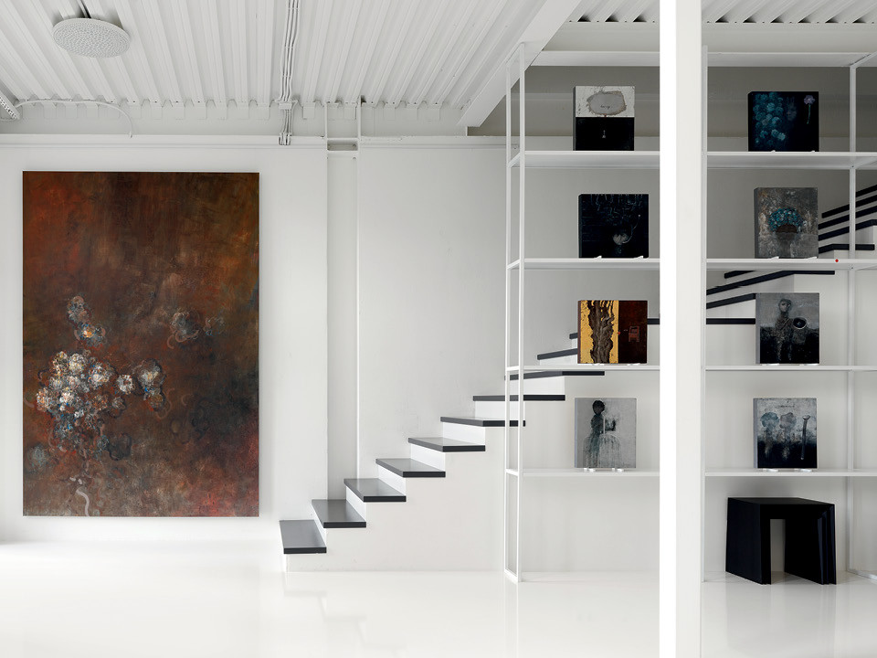 Для ремонта Елена созрела как раз к началу пандемии, но осенью уже въехала в обновленное помещение: “Мой принцип — в какой-то момент надо просто выгнать строителей, иначе это не закончится никогда. Так что мы заехали и начали обживаться, на это понадобился еще год”. Когда в декабре галерея собрала гостей на свое первое мероприятие, кто-то пытался снять у порога обувь. Еще бы — на белый глянцевый пол даже ступить страшно! “У меня никогда не было шанса сделать целиком белое пространство, — рассказывает