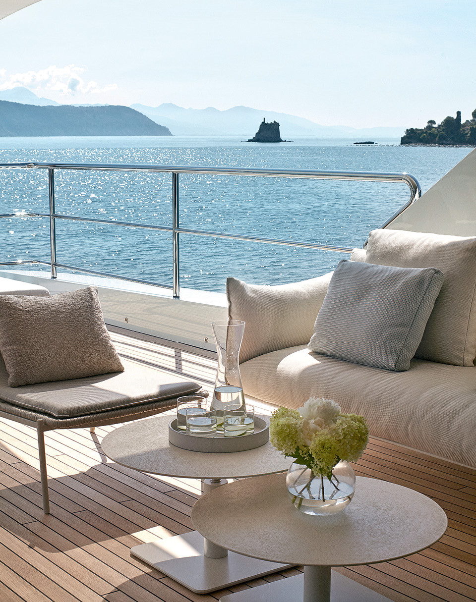 Рафаэль де Карденас уже оформил несколько домов для своих заказчиков, поэтому, когда они решили, что хотят проводить как можно больше времени на воде и им нужна своя яхта, то за дизайн-проектом обратились именно к нему. Но оформлять дома — одно дело, а вот в конструировании яхт есть много сложностей, которые дизайнер решал вместе с инженерами верфи. “Шесть месяцев мы занимались только проектированием, а потом два года строили яхту, — рассказывает Рафаэль. — Я ездил на все фабрики и проводил уйму времени на верфи, чтобы лодка получилась идеальной и, главное, безопасной, ведь мои заказчики собираются ходить на ней как по Средиземному морю, так и на север”. Например, гостиную