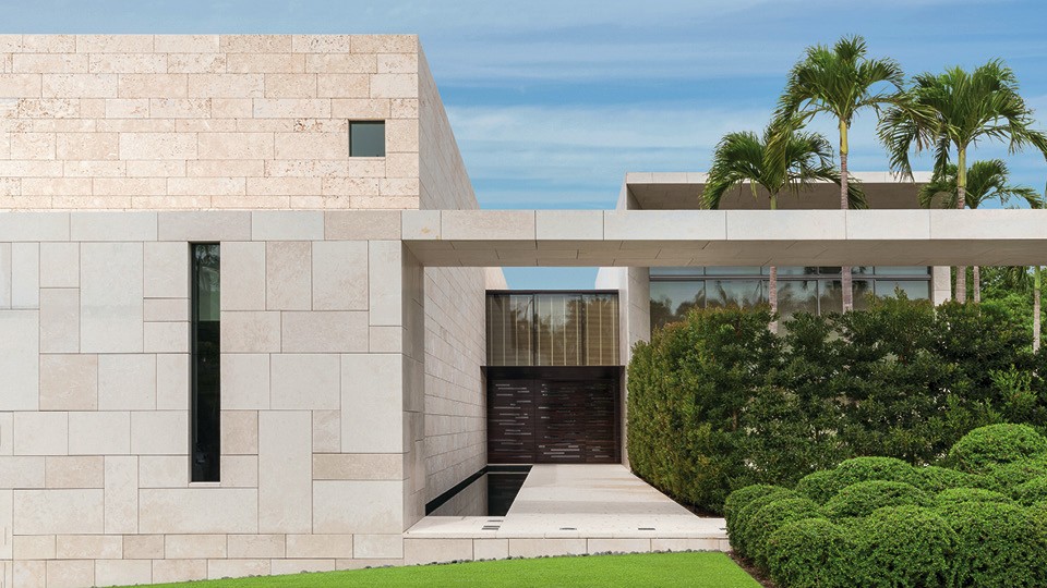Участок был вытянутым в длину и выходил к воде лишь одной узкой стороной. Эти ограничения определили архитектуру дома: он состоит из двух параллелепипедов разных размеров, расположенных параллельно друг другу и соединенных галереей. За предельную лаконичность архитектор прозвал их “коробками для обуви”. Блоки построены из известняка, разнообразие в фасад вносят лишь окна разного размера и формы. Внизу длинного двухэтажного строения разместились хозяйская спальня и двусветная библиотека, а наверху — гостевые комнаты. Архитектор придумал такую планировку, при которой всем этим комнатам достались виды на океан. Второй блок расположен в глубине участка. Он короче и шире, но зато с высокими потолками и панорамным остеклением. Его заняла общая зона