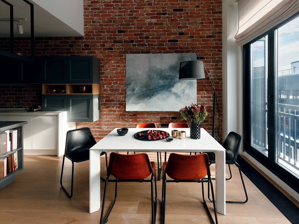 Дизайнеров Анну Пустовойтову и Екатерину Ковальчук Никулины нашли через общего знакомого и попросили их сделать индустриальный интерьер с современной мебелью. Задача была непростая, ведь лофт этот не совсем настоящий. Квартира находится на последнем этаже в отреставрированном здании бывшей фабрики, но именно этот этаж надстроен, оригинальных кирпичных стен там не было. Анна и Екатерина решили использовать для облицовки стен кирпич девятнадцатого века, его нашли в “мастерских Братьев немцеВ”. Кстати, на одном из кирпичей есть клеймо “Максимовский”.