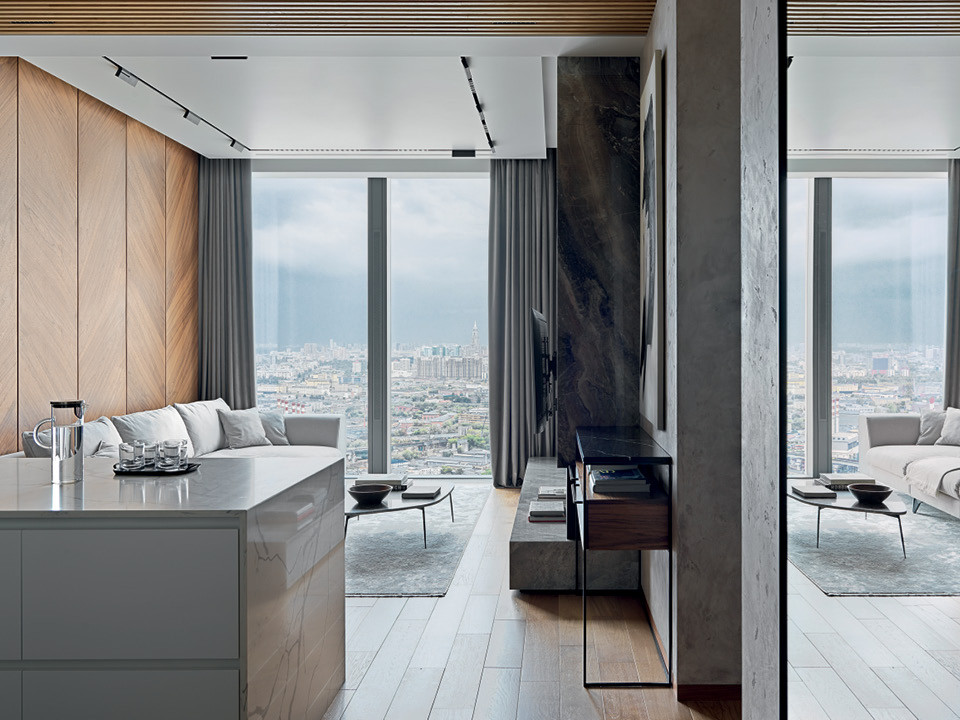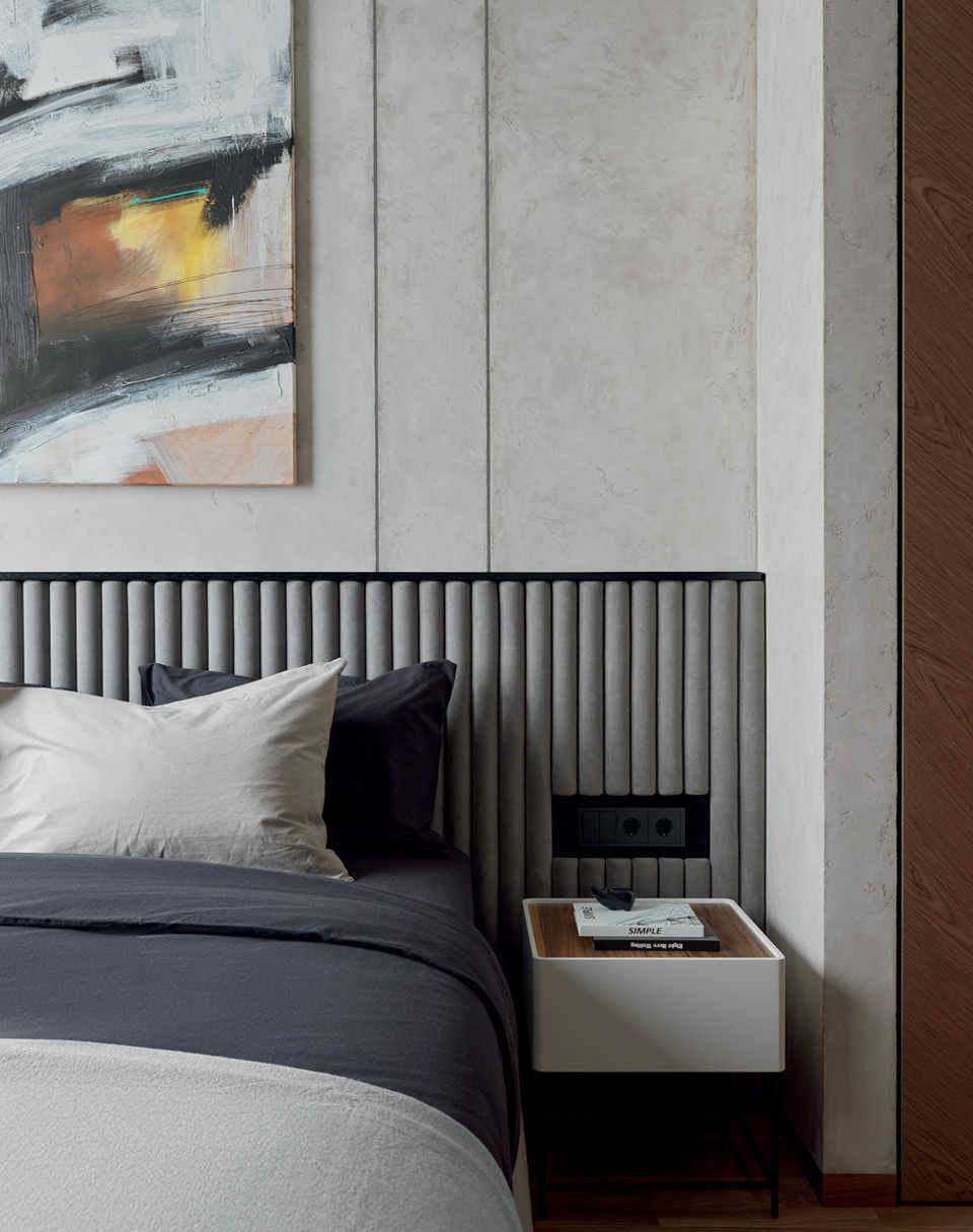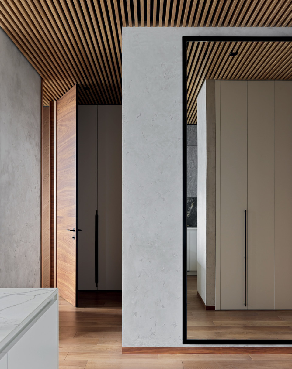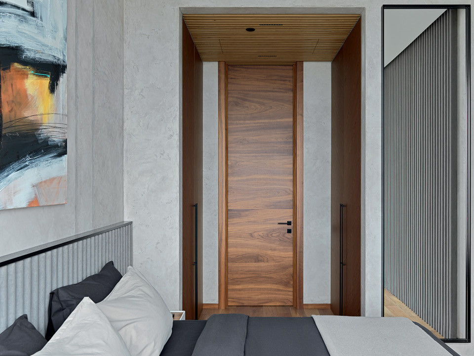 “Первое, что нам бросилось в глаза, — панорамное остекление и вид на город. Было бы глупо строить концепцию вокруг чего-то еще”, — рассуждает Азат. Рисунок текстильных панелей в спальне и деревянных в гостиной, пропорции стеллажа, высокие двери — все здесь работает на то, чтобы подчеркнуть вертикаль. Так часто делают, чтобы зрительно поднять низкий потолок. Здесь высота комнат приличная, около 3,3 метра, но авторы проекта хотели зарифмовать интерьер с панорамой города.