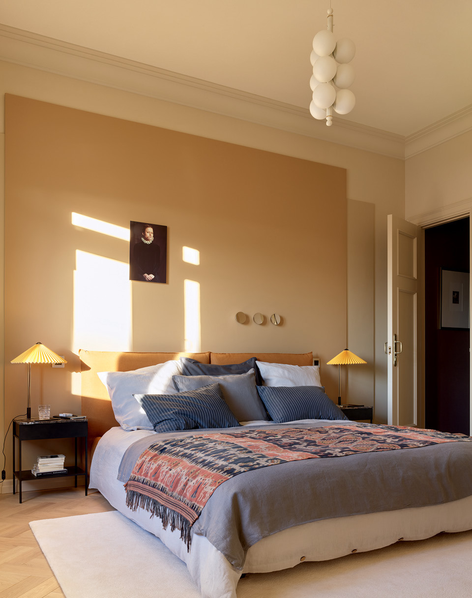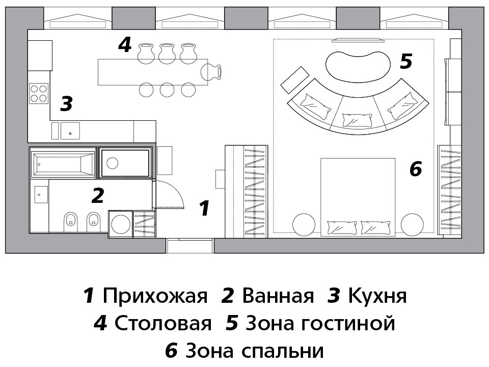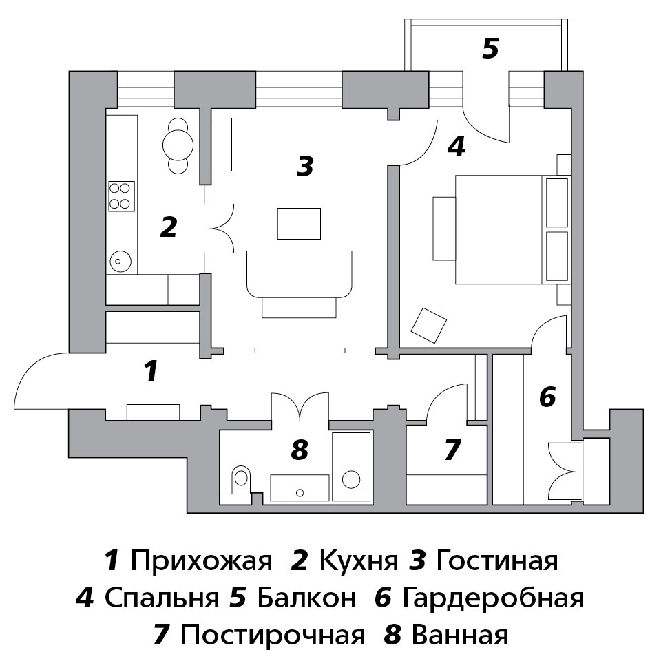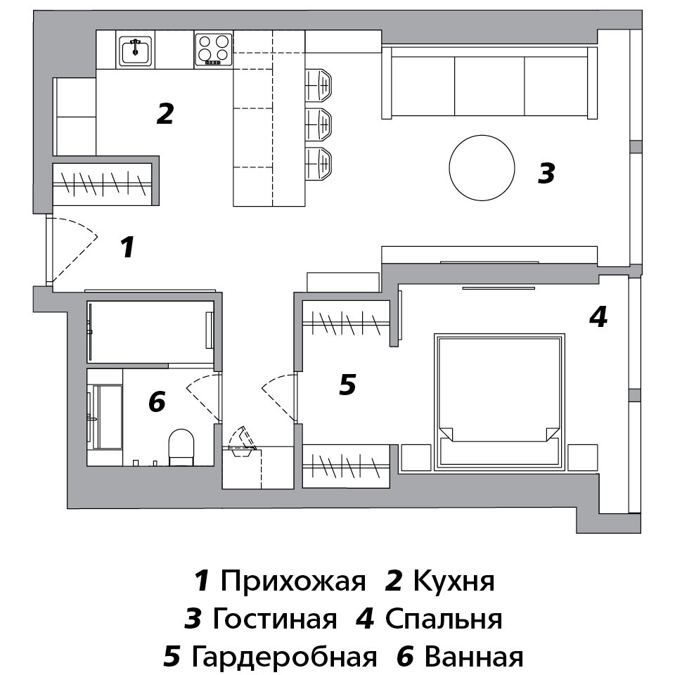 Площадь квартиры небольшая, всего 50 м², но при таких размерах у нее есть достоинства: высокие потолки и шесть окон. Несущих стен тут не было, поэтому архитектор снесла все перегородки и сделала новую планировку. Угловой спальне достались сразу три окна, она совмещена с проходной гардеробной, через которую можно попасть в ванную комнату. В своих проектах Елизавета часто делает гардеробную проходной — это удобно и соответствует логике движения человека с утра или вечером перед сном.
