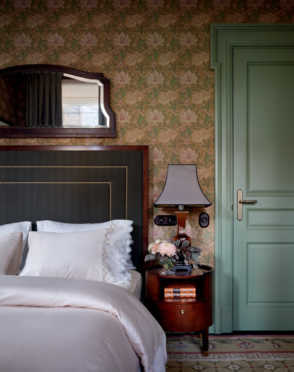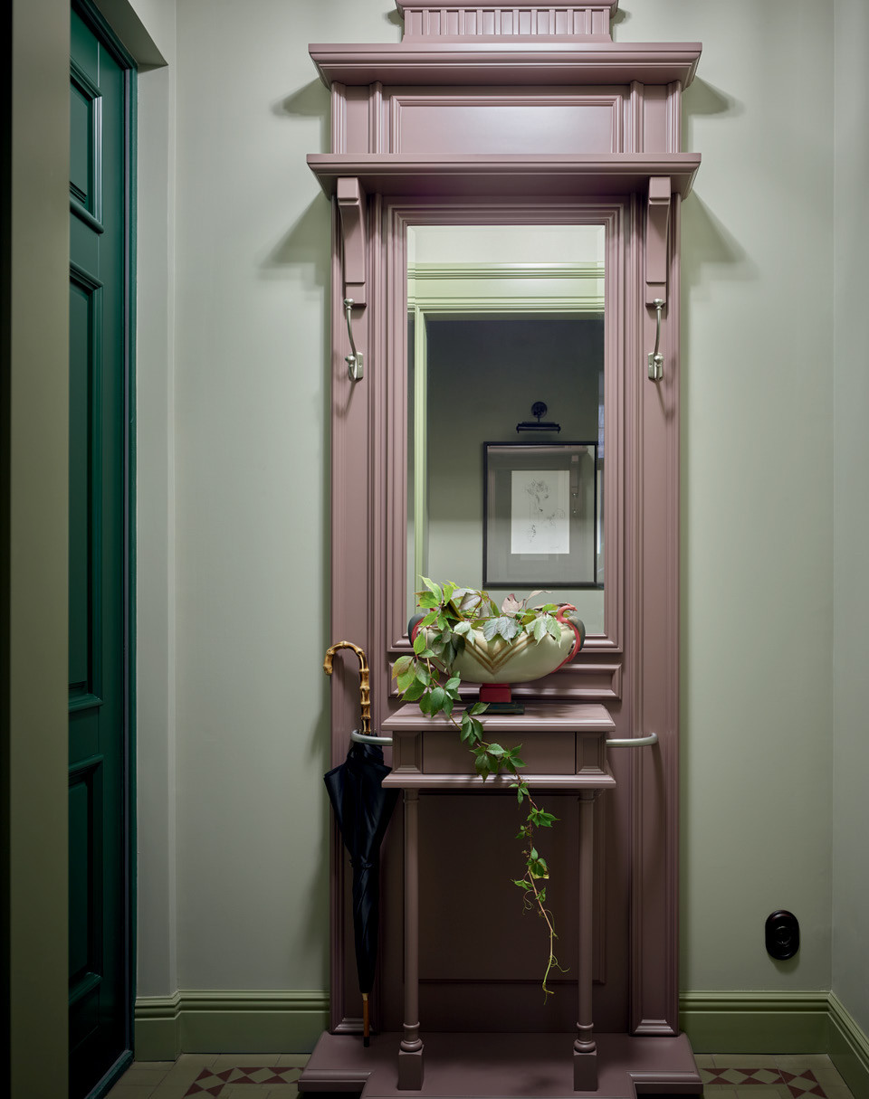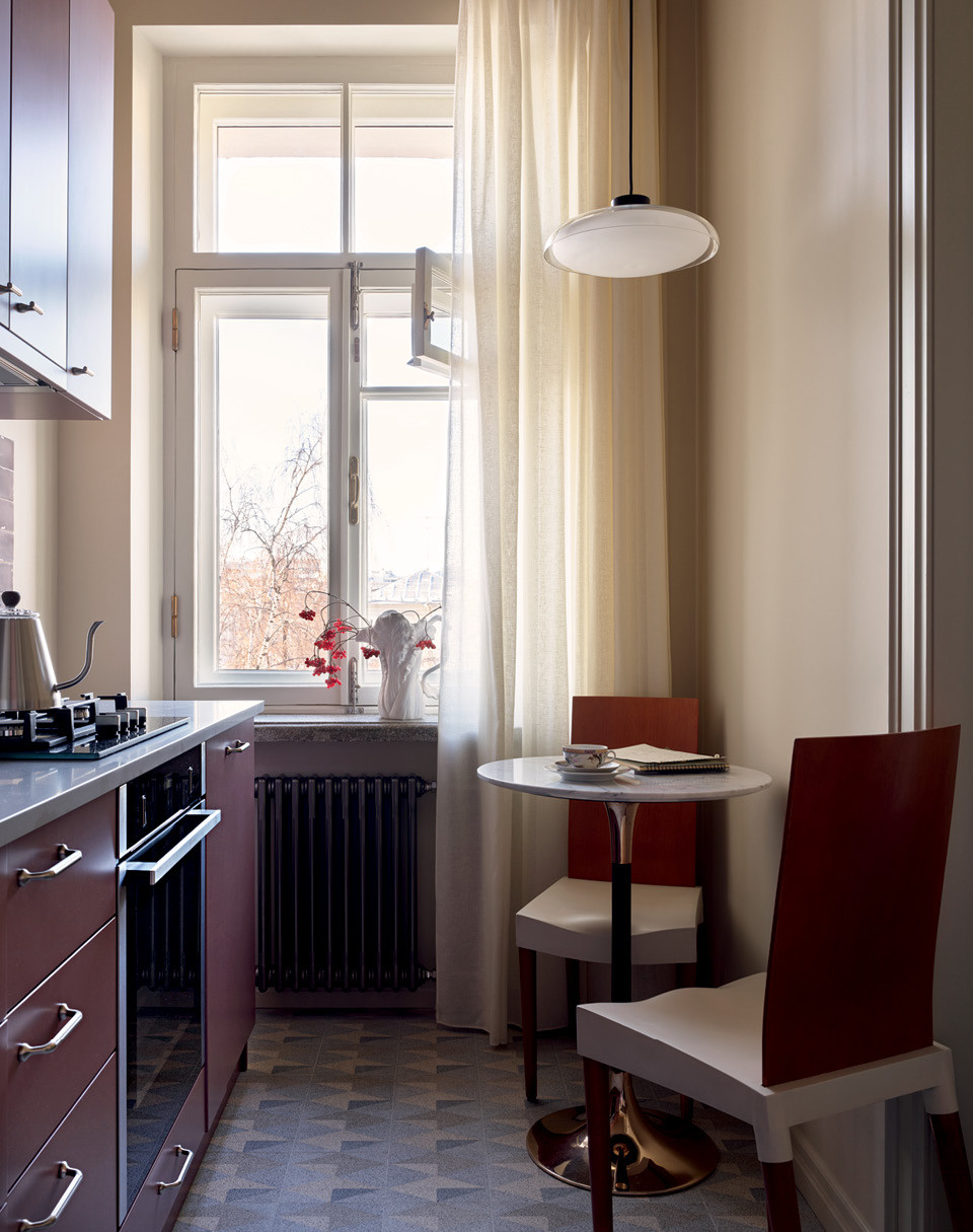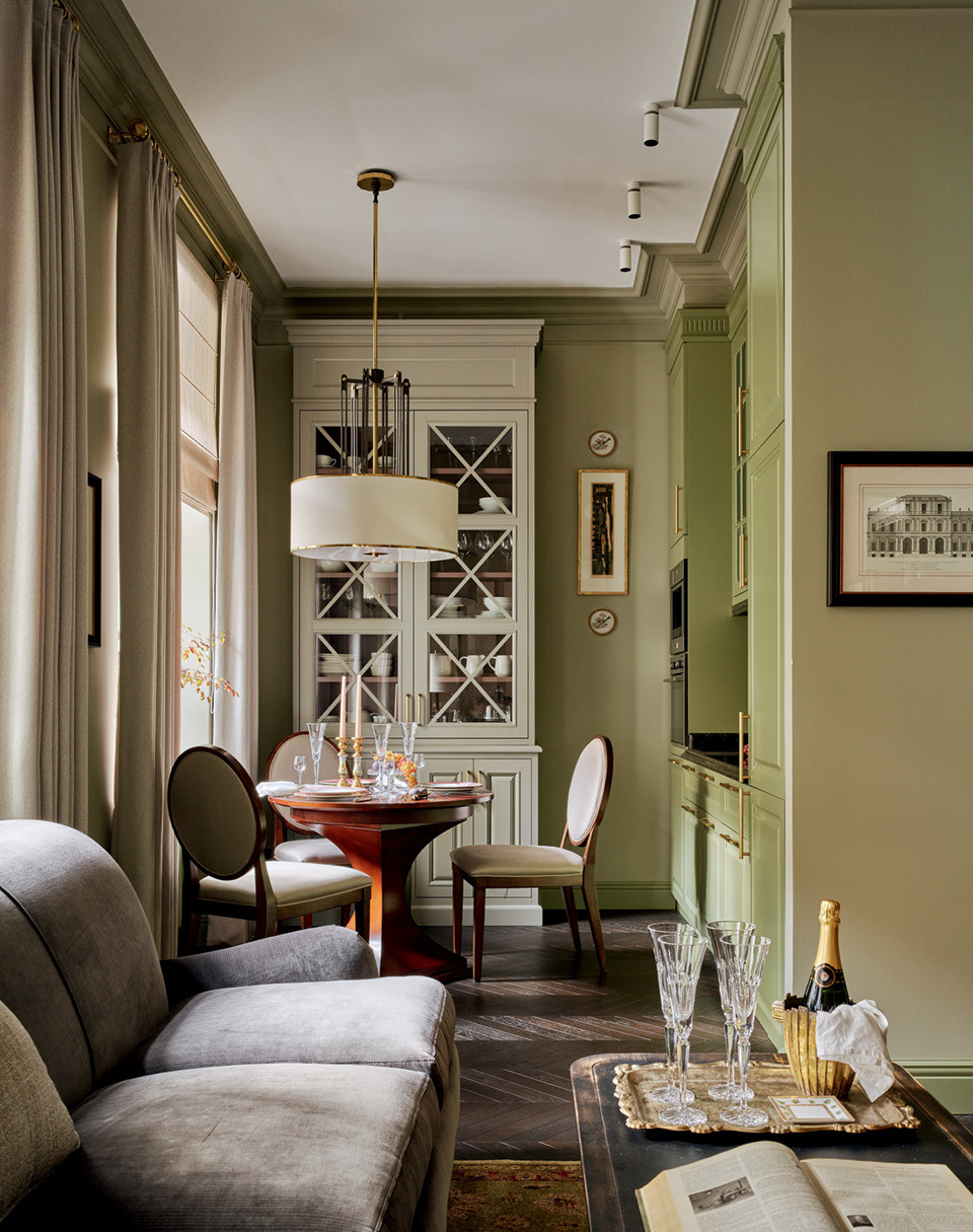 “Набор основных функций и предметов в этой квартире усечен. Это продиктовано не только назначением пространства, но и его размерами, — говорит Елизавета. — К примеру, кухня оборудована по минимуму: плита маленькая и все остальное тоже компактное, потому что званые ужины тут никто не собирался устраивать. Гардеробная также небольшая, только для самого необходимого”. При этом пространство кажется просторней, чем есть на самом деле: такое впечатление производит классический, детально проработанный интерьер и насыщенная цветовая гамма. Основной цвет здесь зеленый — в него выкрашены двери, фасады кухни, стены, плинтусы и даже батареи. Высокие дверные проемы, портьеры от самого потолка и карнизы в тон стенам добавляют объема и торжественности всему пространству. “В целом получился уютный и универсальный интерьер, в котором будет комфортно и дочке, и ее отцу”, — говорит Елизавета Медведева.