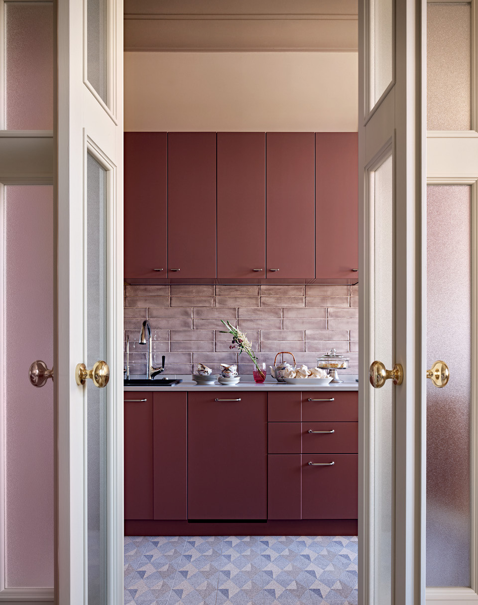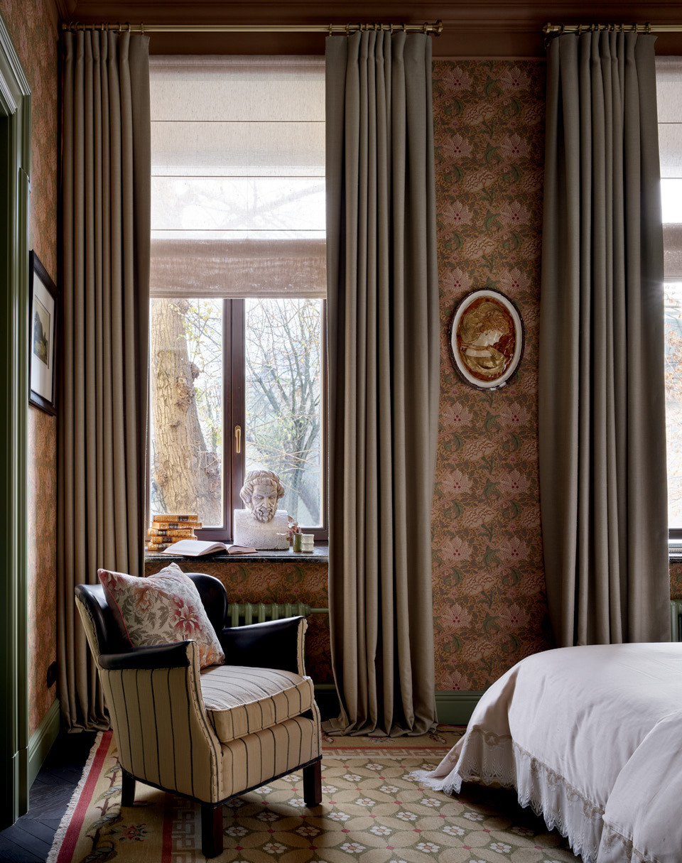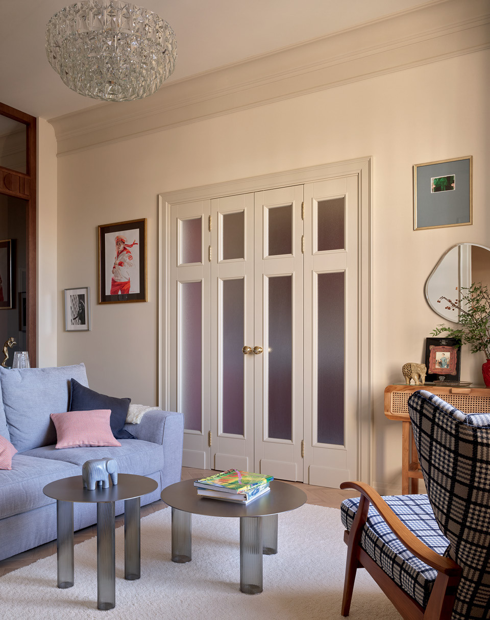 Под все параметры подошла эта 65‑метровая квартира в “сталинке” на Космодамианской набережной. “Пространство было таким же, как на момент сдачи дома в 1930‑х годах”, — вспоминает Юлия. Старые узорные обои пожелтевшего цвета, паркет “елочка”, аутентичные двери и деревянные окна. Последние оказались особенной удачей: Екатерина и Юлия сразу же сошлись на том, что их нужно восстановить (благо состояние рам позволяло это сделать).