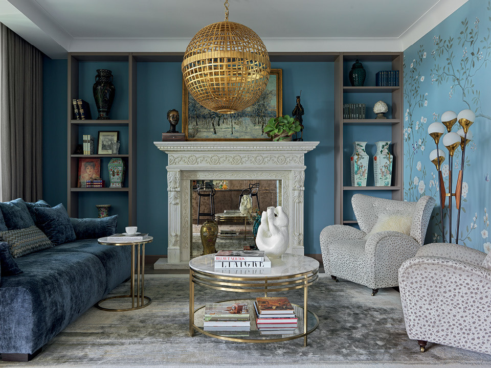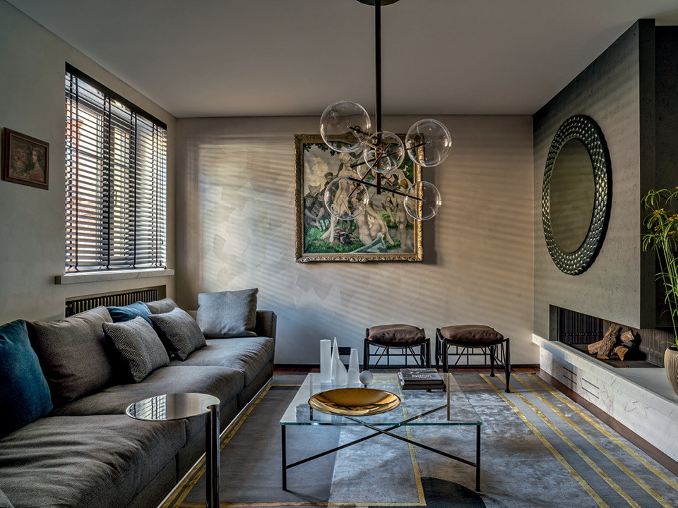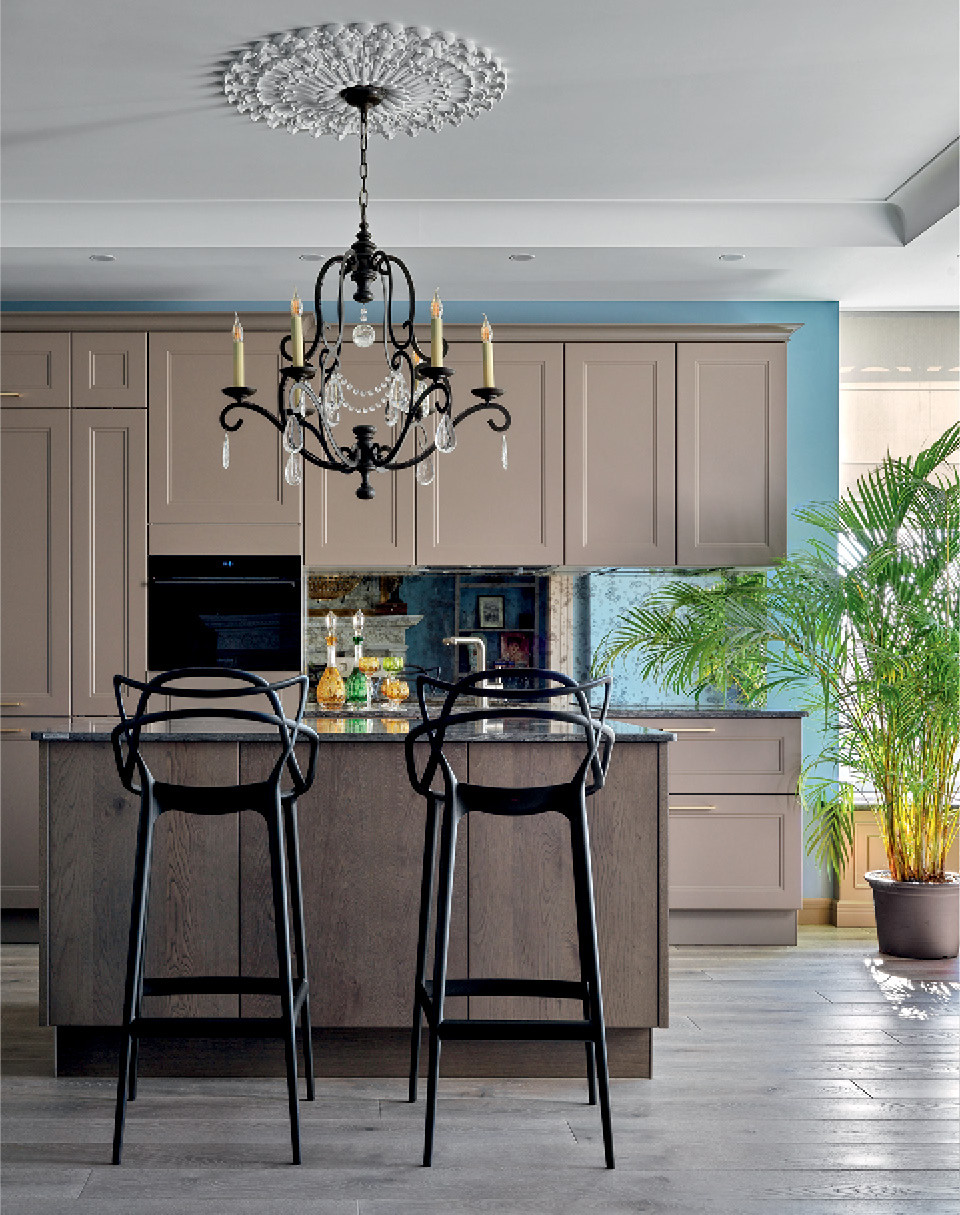 При площади около ста квадратных метров квартира кажется довольно компактной — эффект игры с масштабом, которая началась случайно, но в итоге стала ведущим приемом. Сперва появился камин: “Мы влюбились в него, когда поехали выбирать мрамор в санузлы. Мы предполагали, что у нас будет камин, но не думали, что такой большой”. Следом подтянулись огромный светильник-шар и соразмерная ему люстра над кухонным островом. Татьяна довольно долго искала к этому острову подходящие сиденья и, как ни странно, остановилась на стульях Филиппа Старка, составивших неожиданный, но гармоничный дуэт с кованым классическим светильником.