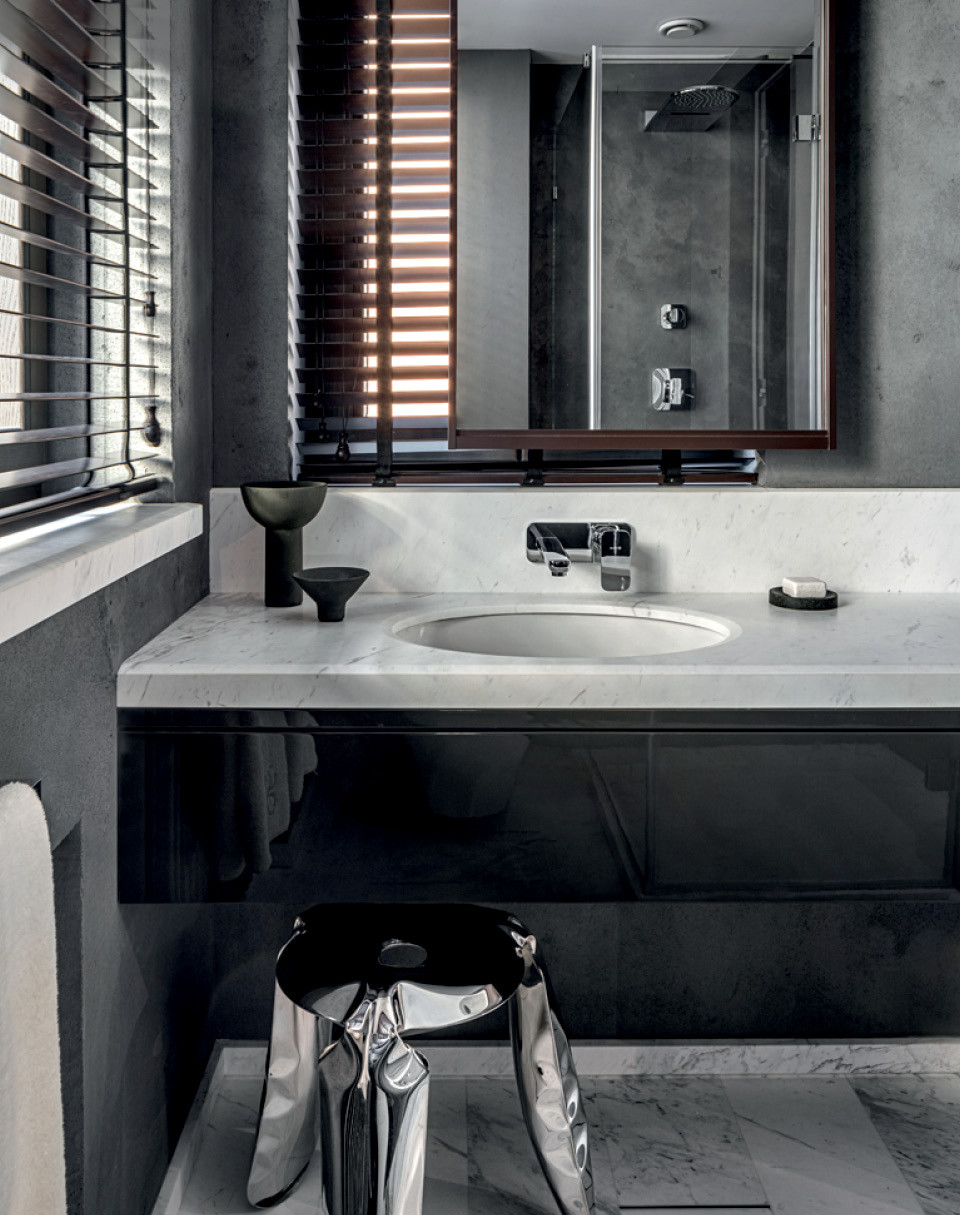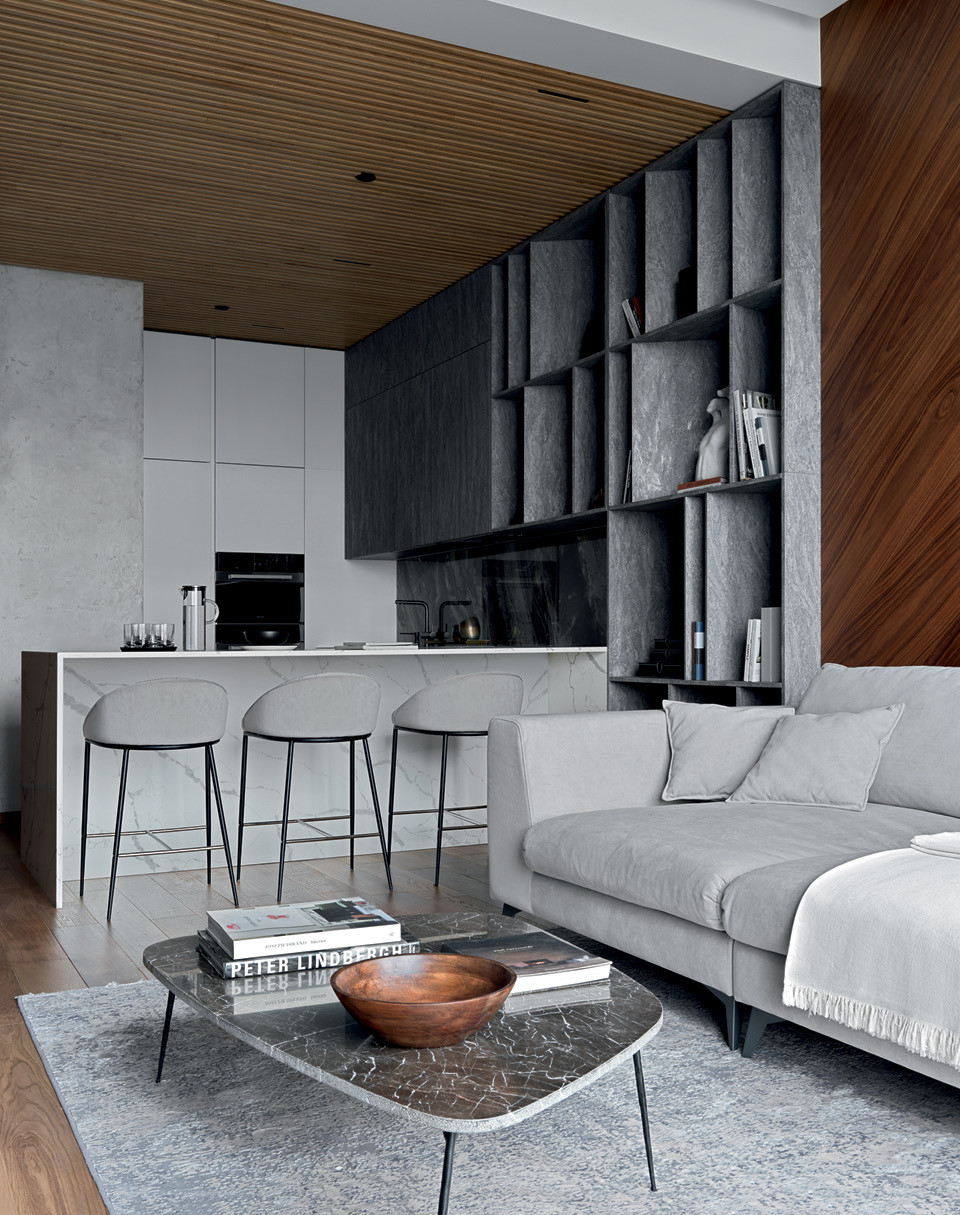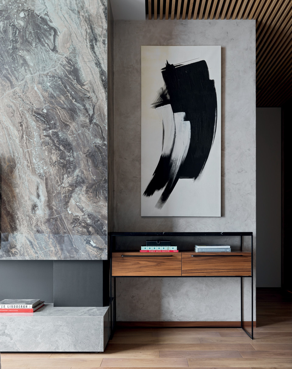 Основной декоративный прием — соединение разных материалов. Они контрастируют друг с другом, подчеркивают объемы, из которых “составлен” интерьер, да и сами по себе тоже хороши. “Для нас первичны форма помещения и его геометрия, — рассказывает Азат. — Сперва мы делаем интерьер в черно-белом варианте, потом задаем контрасты и уже после этого “натягиваем” на него фактуры”. Здесь этот подход дал отличный результат — без всякой натяжки.