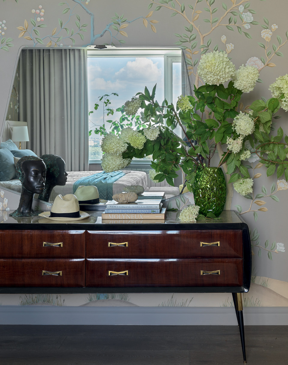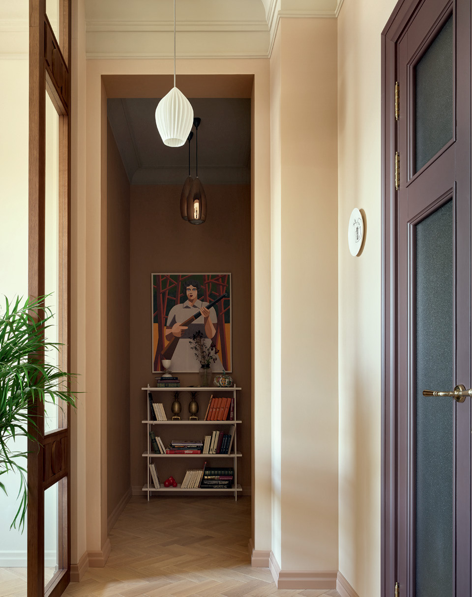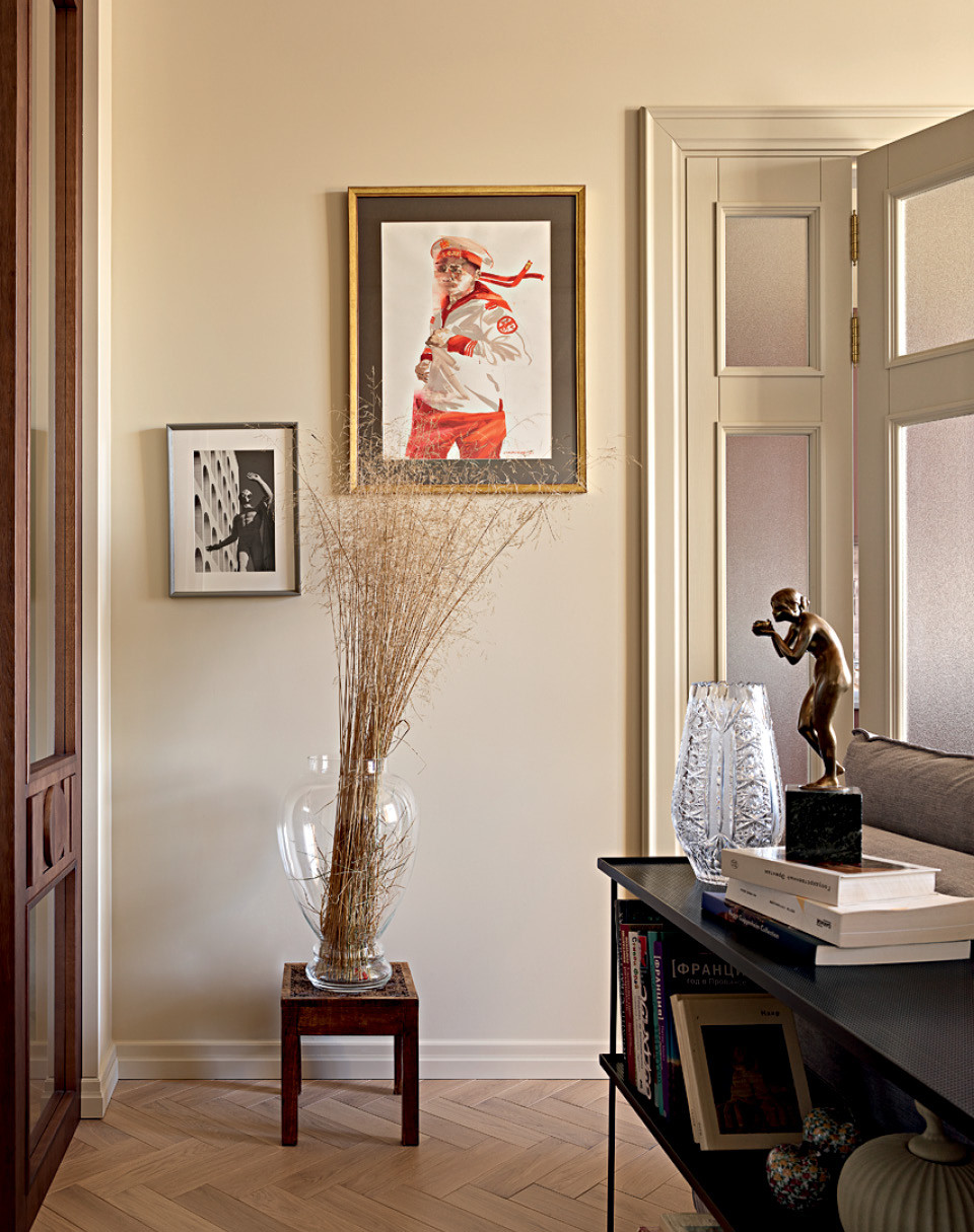 Такие нюансы вместе с теплым оттенком стен (в интерьере практически нет холодного белого цвета) и мягкими формами мебели создают в квартире абсолютное ощущение дома. Поддерживают эту атмосферу декор и искусство. “Все предметы — из родительского дома или личной коллекции заказчицы, но раньше они нигде не находили своего места, — делится дизайнер. — В этой же квартире они как будто простояли всю жизнь”.