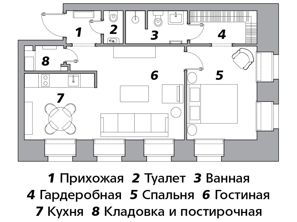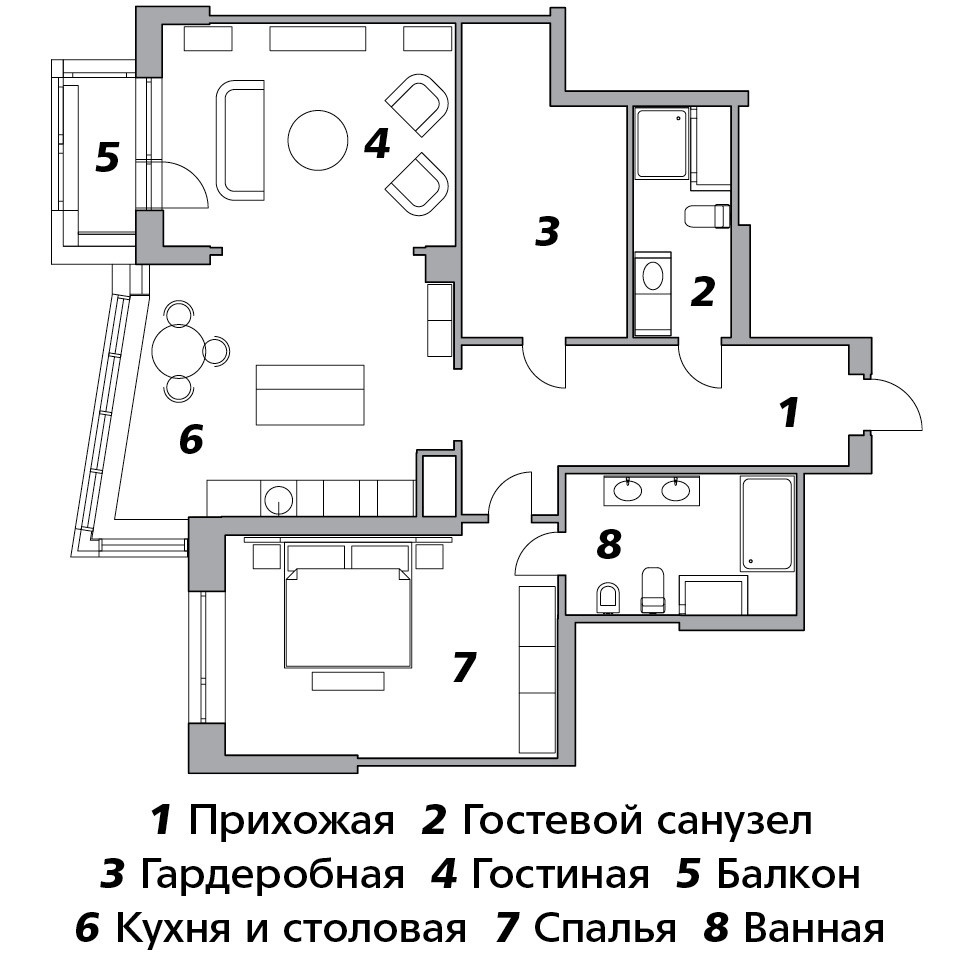 Татьяна рассказывает, что, впервые увидев квартиру, испугалась: “Мало того что одна из стен идет под неправильным углом, в гостиной под потолком проходят трубы пожарной сигнализации, отнявшие около полуметра высоты”. Но благодаря взаимопониманию между хозяйкой и дизайнером все быстро встало на свои места: Татьяна поменяла назначение комнат (спальня теперь находится на месте гостиной), объединила кухню с гостиной, выделила место на двенадцатиметровую гардеробную и увеличила санузлы.