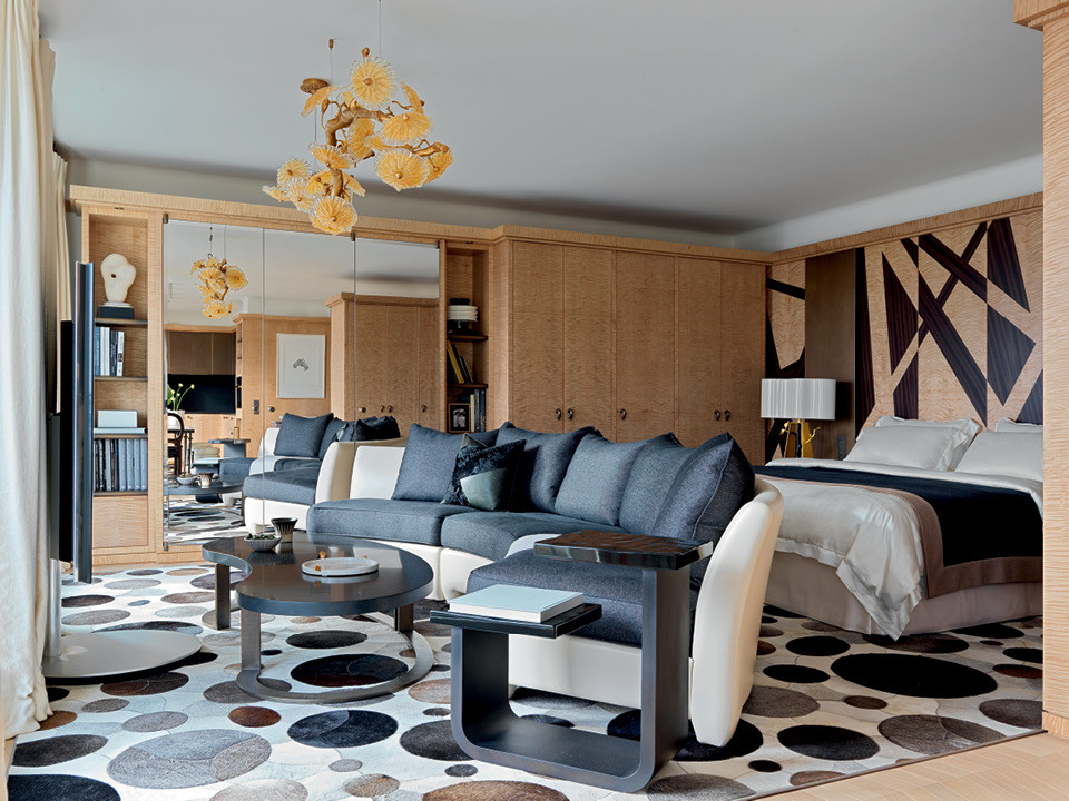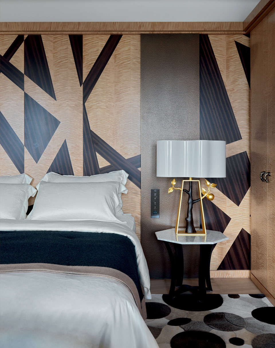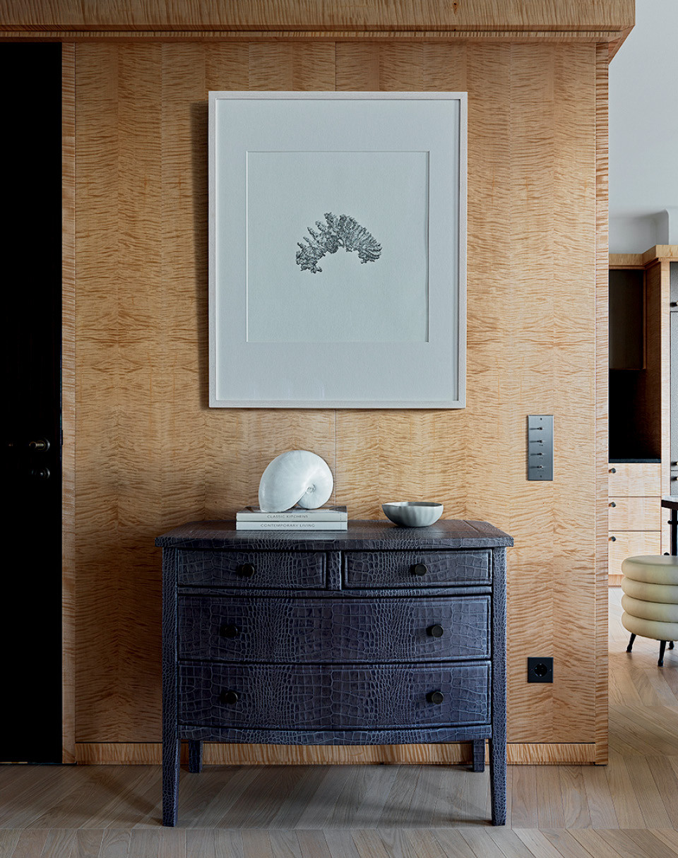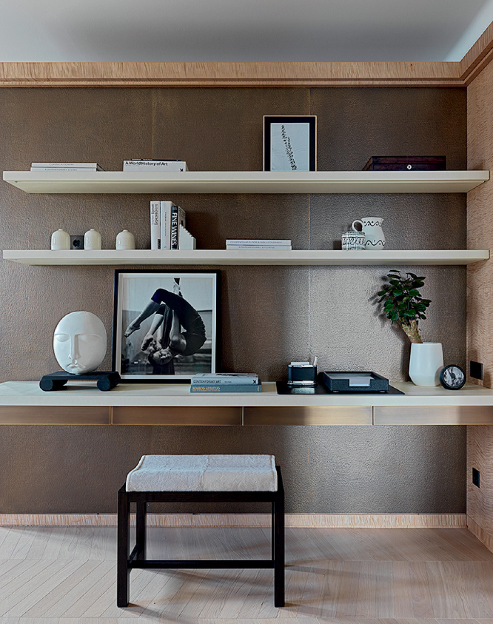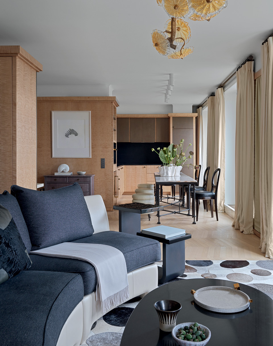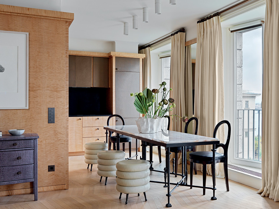 Оформлять квартиру хозяева пригласили дизайнеров Елену Спиридонову и Романа Андрусенко из бюро Copper & Tin, с которыми они уже работали вместе и остались очень довольны сотрудничеством. “Заказчики сказали, что им нравятся открытые пространства, благо несущих стен не было, поэтому мы убрали все перегородки, а зоны разграничили при помощи мебели, — рассказывает Роман. — Для них было важно выделить рабочее место и сделать достаточно мест для хранения”. Прихожую и спальню с гостиной разделили при помощи столярной конструкции, с одной стороны — рабочий стол и полки, отделанные белой кожей и бронзой, а с другой — платяные шкафы. В полностью открытом пространстве важно соблюдать единство материалов, поэтому фасады шкафов, кухонный гарнитур и стеновые панели сделаны из массива сикомора со вставками из зебрано и листов бронзы. Для того чтобы визуально увеличить высоту помещения, дизайнеры намеренно не доводили дерево до потолка, а за карнизами пустили подсветку. Заказчица любит моду, и она хотела, чтобы это увлечение было отражено в интерьере. Так, ее любимое платье из кожи и каракульчи от Chanel подсказало выбор материалов для диванных подушек. Кстати, сам диван тоже выбрала хозяйка квартиры — ей очень нравится модель от Promemoria, но в ассортименте марки не было полукруглой формы, и фабрика выполнила его на заказ.