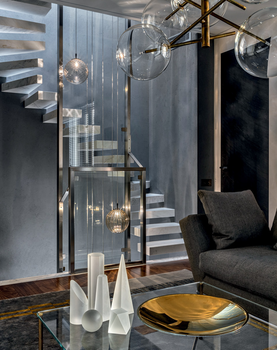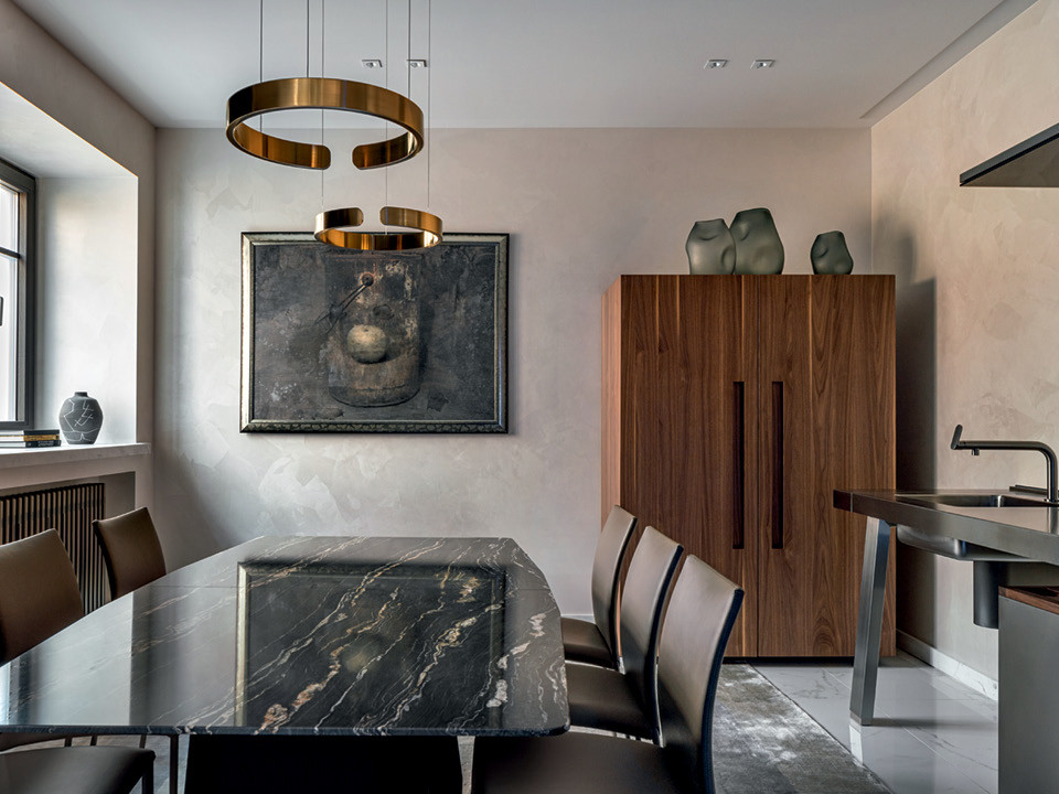 Это не основное жилье заказчика, поэтому архитектор решил создать здесь атмосферу как в люксовом отеле. Этим, например, обусловлен выбор материалов: мрамор, полы из ореха, каменный шпон, которым отделаны двери в санузлы, и качественная кожаная мебель. “Квартира не предназначалась для постоянного проживания, и это отразилось на дизайне интерьера. Здесь много эффектных решений. Интерьер должен производить впечатление на гостей, но при этом тут чувствуется уютная домашняя атмосфера”, — объясняет Демьянов. Так, скульптурная лестница, предмет гордости архитектора, пронизывает все этажи. Ее ступени не касаются металлического ограждения и будто парят в воздухе, но все рассчитано таким образом, чтобы по ней можно было безопасно ходить. Инсталляция из светильников на длинных подвесах спускается с самого верха. По желанию заказчика рядом с лестницей также установили лифт, пожертвовав драгоценной площадью. На кухне компанию металлическому столу составляет брутальный холодильник, который смотрится здесь как арт-объект. “Проект оказался очень трудоемким, приходилось высчитывать все до сантиметра, будто делаешь интерьер яхты”, — признается Родион.