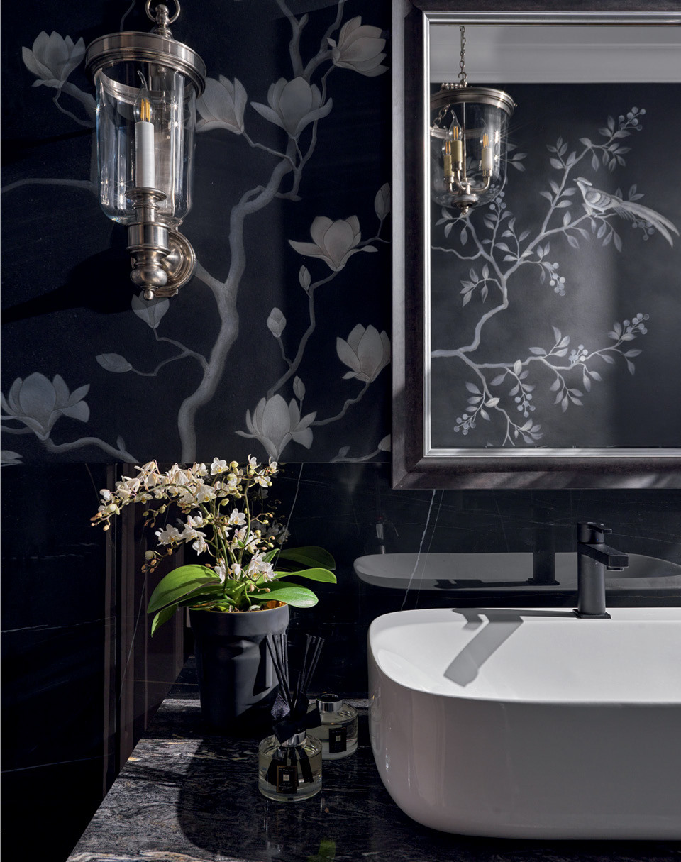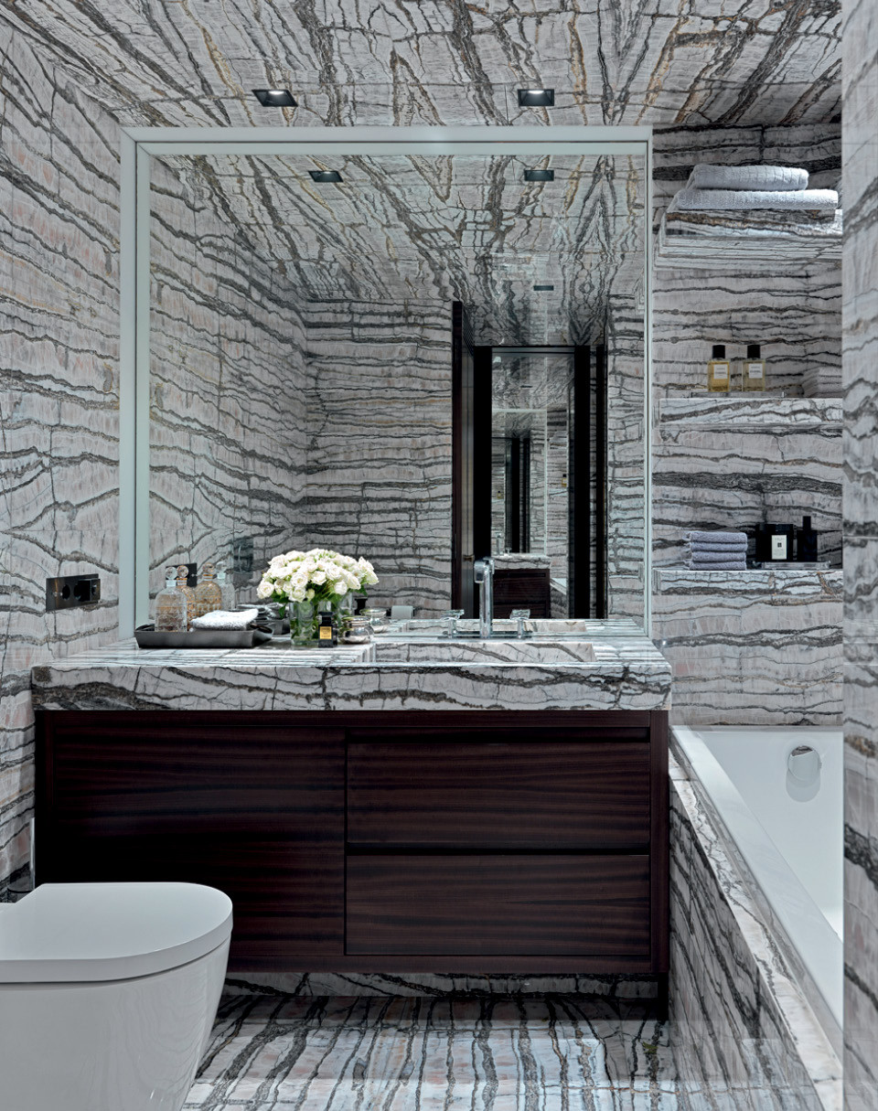 Ванная комната полностью отделана редким видом оникса, который использован в интерьере одного из бутиков Chanel. Необычный камень здесь даже на потолке, поэтому помещение напоминает шкатулку для драгоценностей.