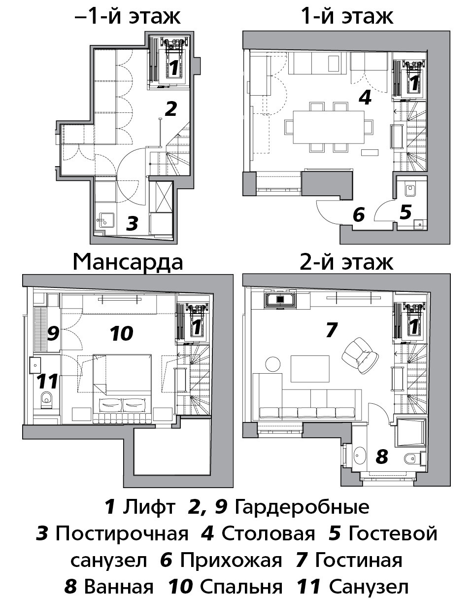 Заказчик Родиона Демьянова живет в основном за городом, квартира в центре недалеко от офиса ему нужна на тот случай, если приходится задерживаться по работе в Москве. Пространство площадью 80 м² довольно необычное — оно распределено между четырьмя этажами. Когда-то это строение было флигелем при усадьбе, а в советское время его использовали как хозяйственный блок. Фактически архитектору достались руины с пустыми оконными проемами, разрушенными перекрытиями и прохудившейся крышей. “Задача была непростая: придумать, как и подо что приспособить маленькие по площади этажи. Мы чуть изменили их высоту, исходя из наших планов”, — рассказывает Родион.