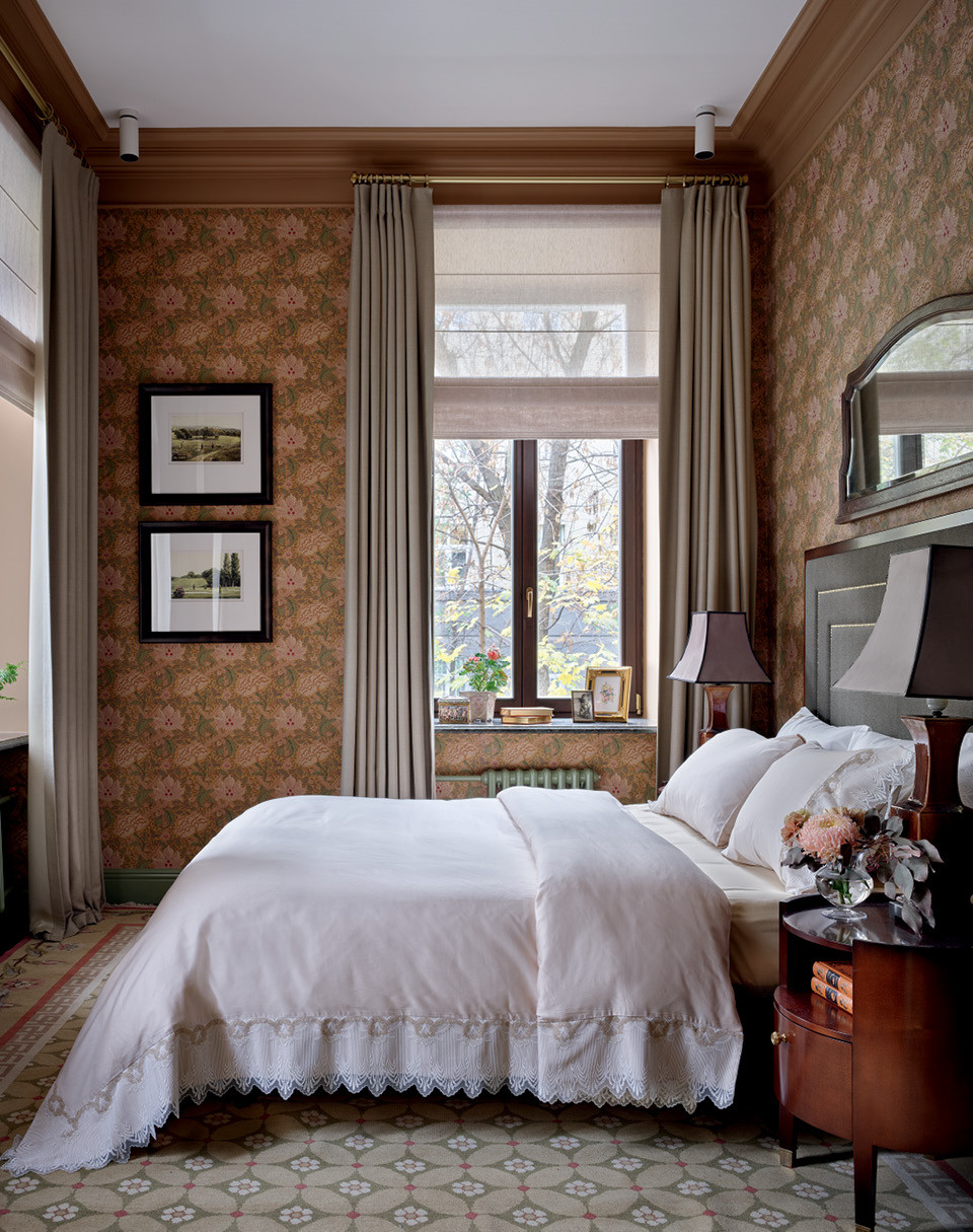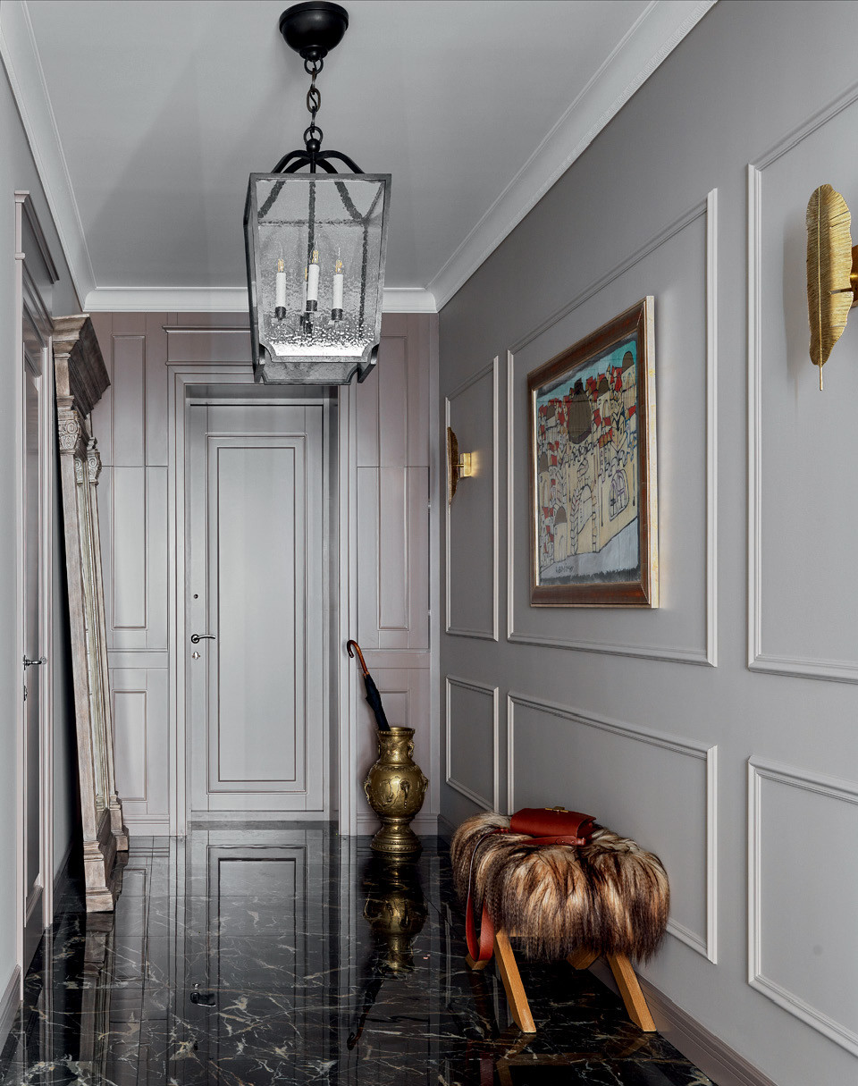 Эта квартира находится в старом доходном доме 1895 года постройки. Она принадлежит бизнесмену, который живет за городом и все дела ведет там же, но решил, что ему нужен “перевалочный пункт” в центре Москвы. “Хозяин — любитель классических интерьеров, поэтому мы сделали мужской интерьер в темных тонах, — рассказывает Елизавета Медведева, работавшая над проектом. — В процессе на объекте он появлялся редко, но результатом остался доволен”. Однако к моменту окончания ремонта жизненные обстоятельства изменились, и квартира перешла к дочке заказчика. “Нам пришлось декорировать ее так, чтобы из чисто мужской она стала девичьей, и мы сделали это с помощью аксессуаров, картин и текстиля”, — добавляет архитектор.