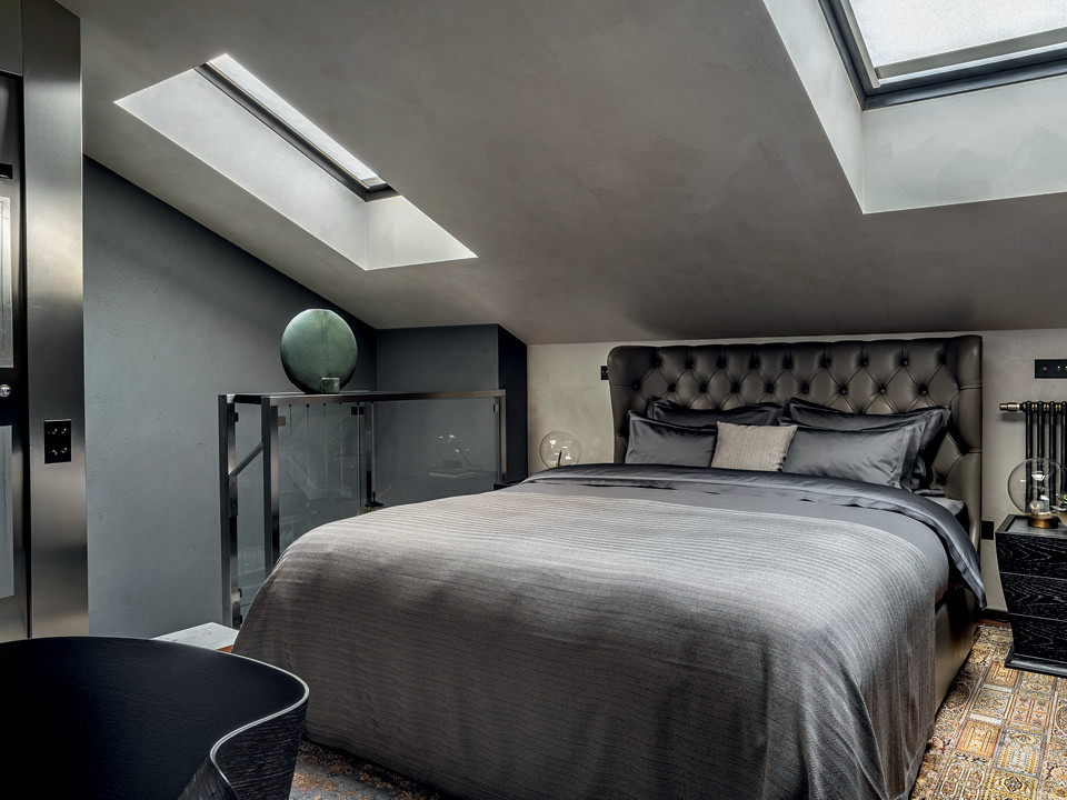 Подвальное помещение самое небольшое, и в нем нет окон, поэтому его отдали под гардеробную, там же есть хозяйственная комната и постирочная. Первый этаж, где находится вход в квартиру, заняли столовая с кухней, и это пространство выполняет представительскую функцию. “Столовую можно использовать как комнату для переговоров, а на телевизор, скрытый за темной стеклянной панелью, выводить видеоконференции, — объясняет архитектор. — Сама кухня не предназначена для того, чтобы на ней что-то готовили. Тут есть брутальный металлический стол с мойкой, напоминающий верстак, и шкаф, куда спрятаны кофеварка и посудомоечная машина”. Над столовой расположилась небольшая уютная гостиная с действующим камином — это уже личное пространство хозяина. Тут же основная ванная комната с окном. А на самом верху, в мансарде, находится спальня. При ней архитектору удалось выкроить место для маленькой гардеробной и санузла.