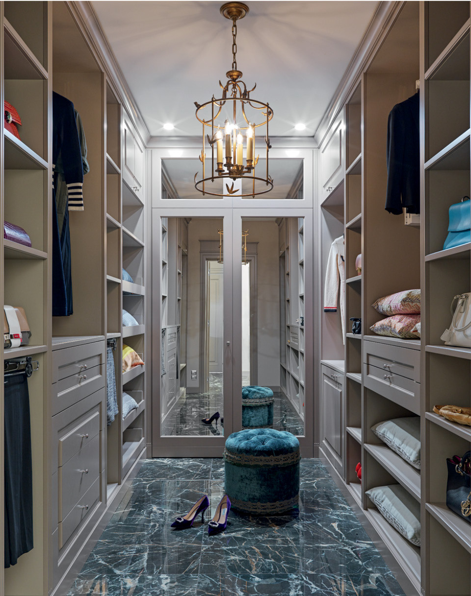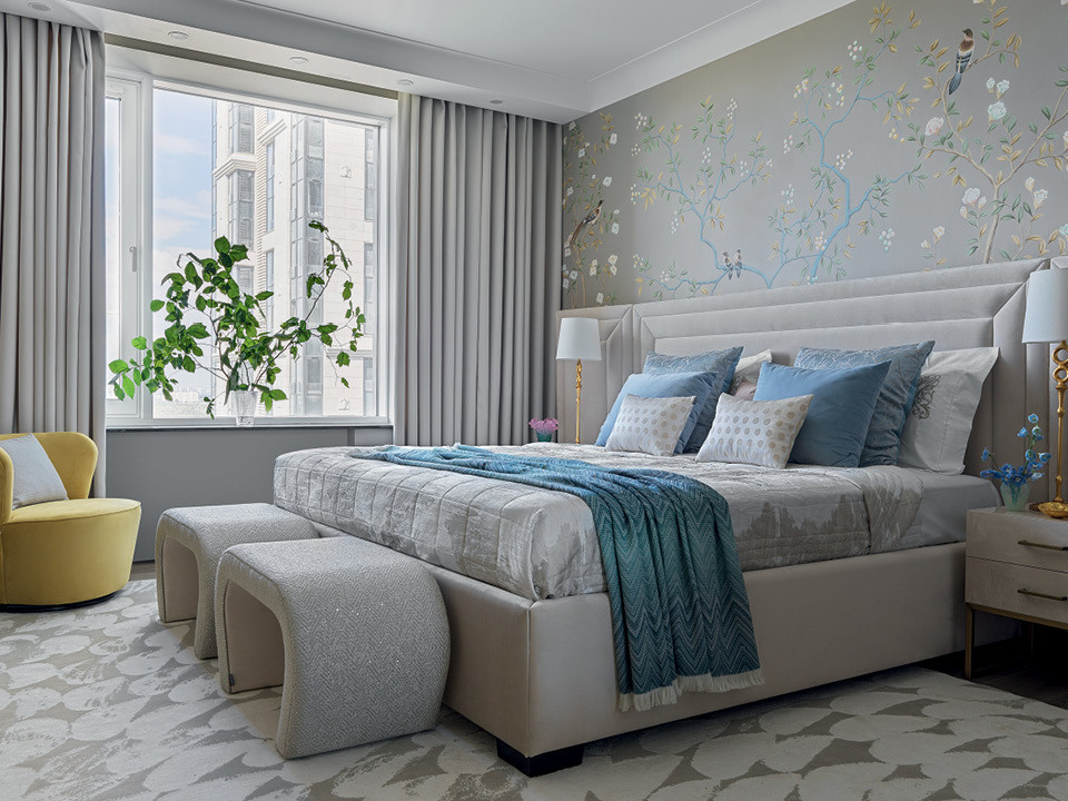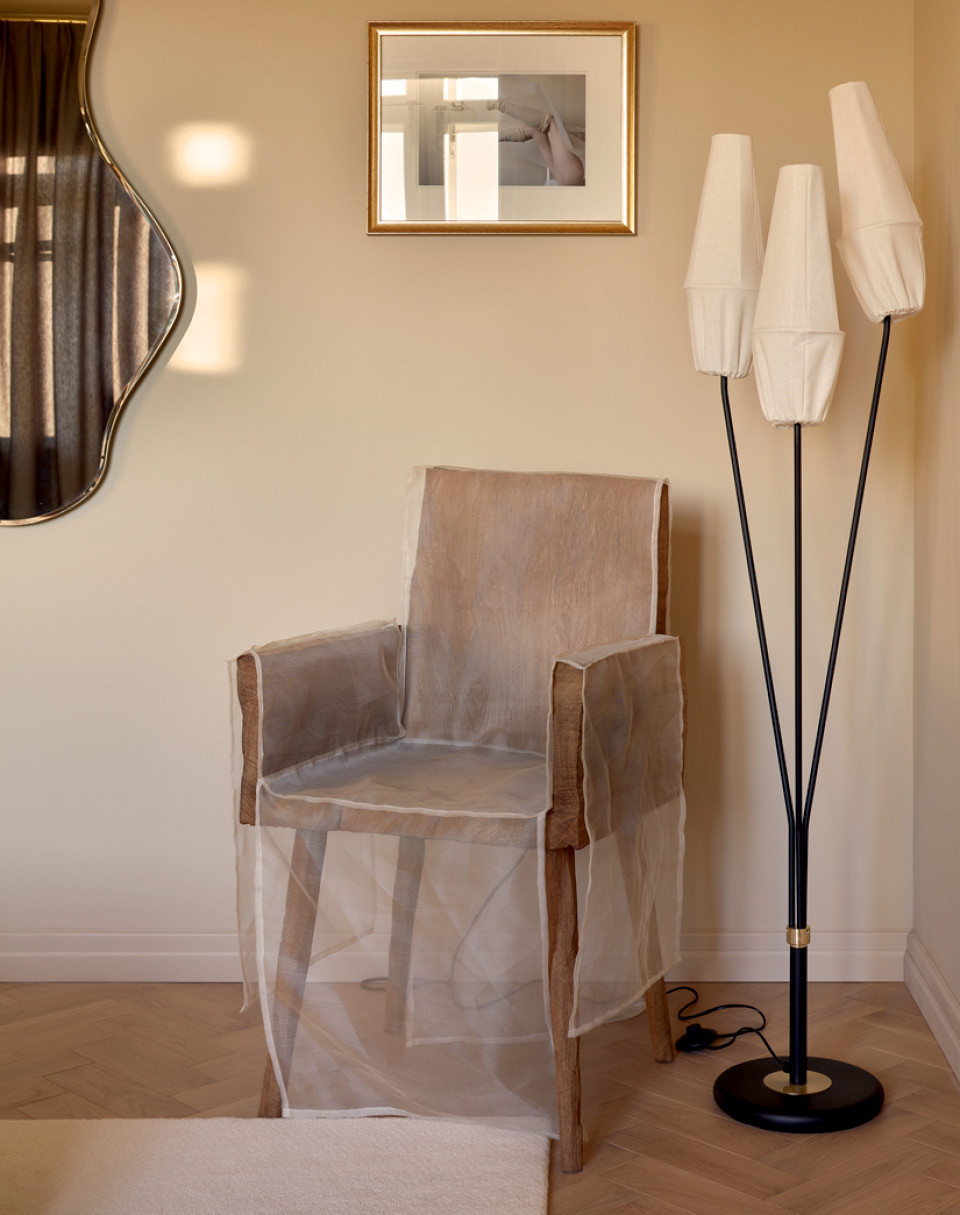 Заказчицу это нисколько не смутило, Екатерина всегда рада покрасоваться, и внушительный гардероб тому доказательство. Для вещей специально выделили отдельное помещение при спальне, зато в самой комнате нет ничего, кроме кровати, прикроватных тумбочек и кресла по дизайну Дениса Милованова. Изначально этот экземпляр с грубой деревянной фактурой не очень вписывался в поэтичный интерьер, но когда Юлия “одела” его в полупрозрачную вуаль, предмет перевоплотился в “романтичную особу”, и на него можно элегантно бросить одежду.