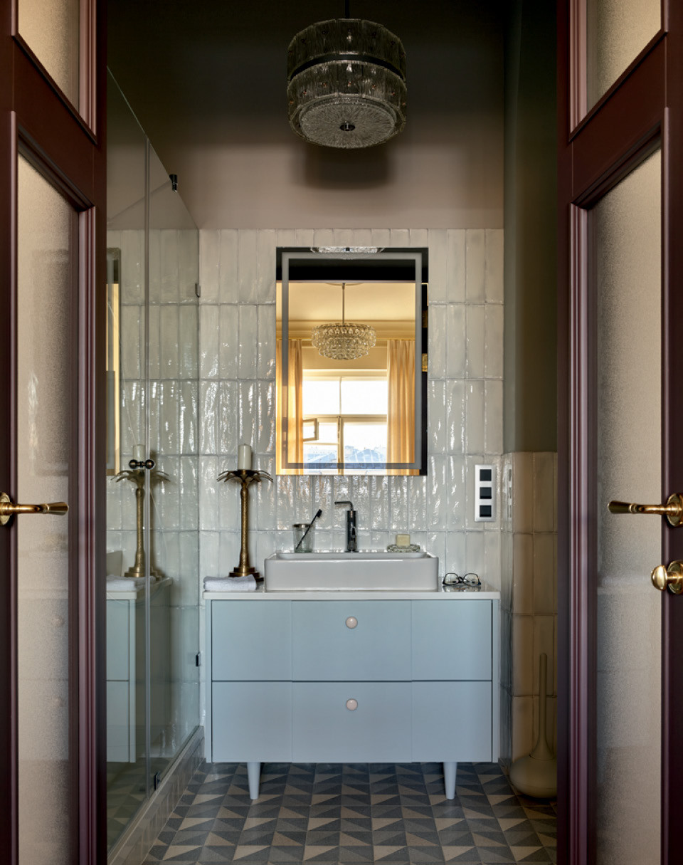 Забавно, но в квартире с большим количеством традиционных деталей ощущается скорее настроение 1960‑х годов. Не в последнюю очередь благодаря светильнику, отбрасывающему по комнате блики, словно диско-шар. Татьяна добавила в интерьер и несколько винтажных деталей — торшер в гостиной и комод в спальне.
