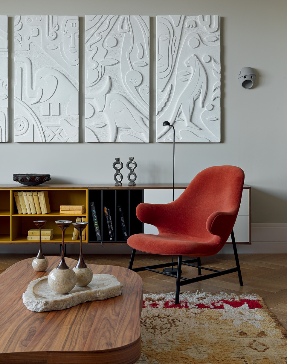 Активно к поиску квартиры заказчики Федорову не привлекали, но советовались. И в конце концов купили 175 квадратных метров на 36‑м этаже новостройки на Профсоюзной. Квартир в доме много, но такая — только одна. Все дело в планировке. “По плану БТИ при входе был тридцатиметровый транзитный холл. Место пропадало, и я предложила сделать там кухню и столовую”, — рассказывает дизайнер. В этой части квартиры нет окон, но планировка придумана так, чтоб свет попадал сюда из гостиной, там его вдоволь. Для самой Екатерины проект тоже вышел необычным. “Заказчикам нравится, что квартира не похожа на другие мои работы”, — говорит она. Сперва дизайнер хотела ввести в проект свой любимый синий цвет, но хозяева не разделяли эту страсть — им больше нравится охра. И тогда Екатерина решила построить интерьер на теплых природных оттенках, а в качестве фона выбрала серый — это первый проект в ее практике, где все стены одного цвета. “В последнее время я стараюсь получать результат минимальными средствами”, — говорит дизайнер. В проекте вообще много повторяющихся элементов. Например, парные двери из столовой в хозяйственные помещения имеют такой же рисунок, как у стеновых панелей