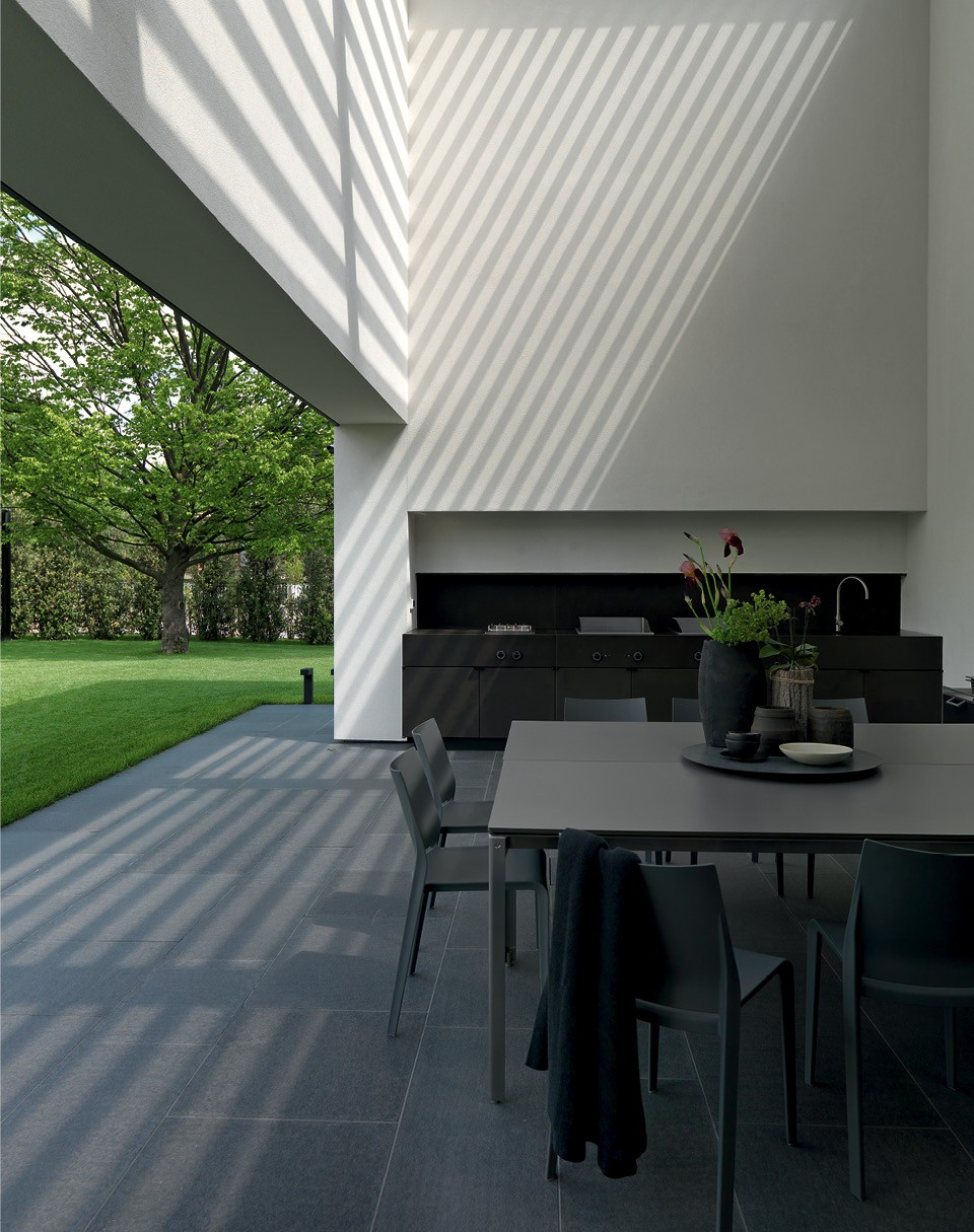 Зона столовой в одном из патио. Мебель, Coro. Полы выстелены плитами серого базальта.