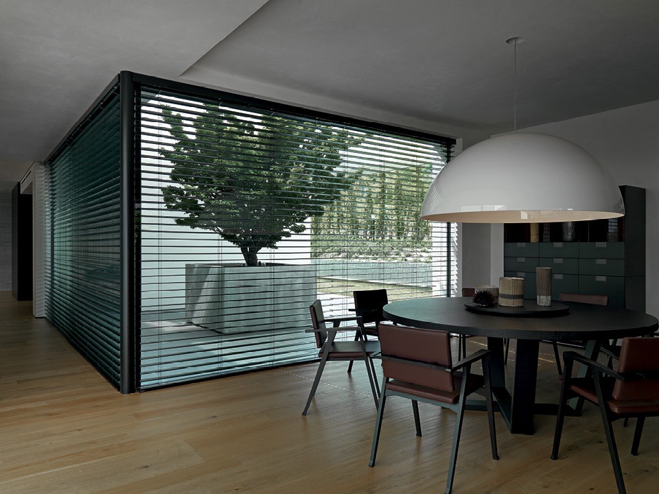Зона столовой. Стол, B&B Italia / Maxalto; стулья, Cassina; светильник, Oluce; дубовые полы, Itlas; окна, Piavevetro.