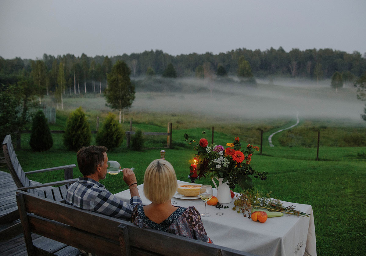 С террасы открывается вид на поле и дальний лес, здесь хорошо просто сидеть и молчать. А рядом будут бегать две огромные немецкие овчарки, Смол и Рекс. Это родные места Валентины. Несколько лет они с Константином делят жизнь между Москвой и Смоленским Поозерьем.