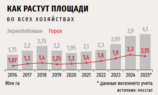 Площади зернобобовых под урожай 2025 года увеличились на 200 тыс. га (или на 5,6 %) по сравнению с показателем 2024-го, следует из данных Росстата (весенний учет). Валовой же сбор, согласно предварительной оценке Минсельхоза, вырастет не менее чем на 35 %, до 7,3 млн т, и станет рекордным. Эксперты оценивали производство еще выше. Так, аналитическая компания «ПроЗерно» в ноябре прогнозировала, что намолот зернобобовых культур составит 7,53 млн т (на 40 % больше, чем в предыдущем году), включая 5,45 млн т гороха. В декабре оценка была дополнительно увеличена: по всем зернобобовым — до 7,7–7,8 млн т (+43 % к показателю за 2024 год), по гороху — до 5,6 млн т. Кроме того, может быть намолочено около 900 тыс. т нута и 800 тыс. т чечевицы, рассказывал тогда гендиректор компании Владимир Петриченко.