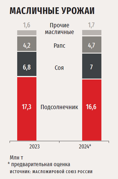 Другие эксперты не так оптимистичны в части сбора урожая. По оценке аналитического центра Ruseed, урожай подсолнечника в России в прошлом году снизился на 14 % по сравнению с 2023-м и составил 14,9 млн т. Производство сои тоже сократилось — на 1 %, до 6,7 млн т. А сбор рапса увеличился на 10 %, до 4,6 млн т.