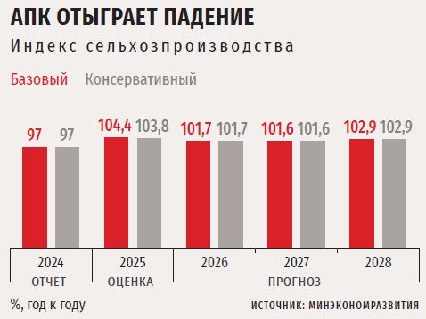 Согласно базовому варианту среднесрочного прогноза социально-экономического развития России до 2028 года, подготовленному Минэкономразвития, в этом году производство сельхозпродукции может увеличиться на 4,4 %. Консервативный вариант предполагает рост на 3,8%. В прошлогоднем сентябрьском прогнозе ведомства показатель в базовом сценарии был таким же, в консервативном ожидалось снижение производства сельхозпродукции на 0,8 %.