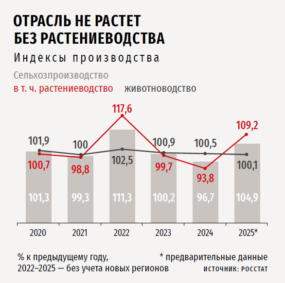 Ведущий научный сотрудник Центра агропродовольственной политики Института прикладных экономических исследований РАНХиГС Денис Терновский, напротив, считает, что темпы роста производства продукции сельского хозяйства оказались близки к ожиданиям, по крайней мере к тем, которые сформировались в середине 2025 года, когда стало ясно, что относительный неурожай зерновых на Юге будет в достаточной степени компенсирован за счет других регионов. «Растениеводство идет к предсказанному аналитиками плато в 150 млн т зерна, но есть вопросы — сможет ли оно пробить его дальше с технологической точки зрения и будет ли это выгодно экономически с учетом того, что урожаи растут не только в России и на мировом рынке есть более дешевое зерно», — рассуждает эксперт.
