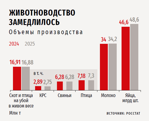 Производство скота и птицы на убой во всех хозяйствах по итогам прошлого года снизилось на 0,2 % относительно 2024-го и составило 16,88 млн т в живом весе. В том числе в свиноводстве прирост составил 0,2 %, до 6,29 млн т, в птицеводстве — 1,8 %, до 7,3 млн т. Производство КРС на убой сократилось на 5,3 %, до 1,26 млн т. Валовой надой молока в прошлом году увеличился на 0,5 %, до 34,2 млн т, производство яиц — на 4,3 %, до 48,6 млрд шт.