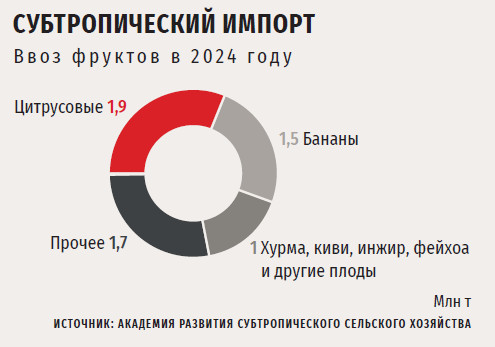 По информации Академии, ввоз субтропических позиций в Россию по итогам 2024 года вырос по сравнению с 2023-м на 2,5 %, до 6,1 млн т (см. график на стр. 58). «99,9 % всех экзотических фруктов и изделий из них импортируется», — подчеркивает Платонов. Наиболее популярные плодовые культуры — банан, апельсин, лимон, мандарин, манго, ананас, папайя и авокадо — поставляются странами Центральной и Южной Америки, Экваториальной Африки, Юго-Восточной Азии и другими государствами с тропическим и субтропическим климатом, максимально удаленными от территории России.