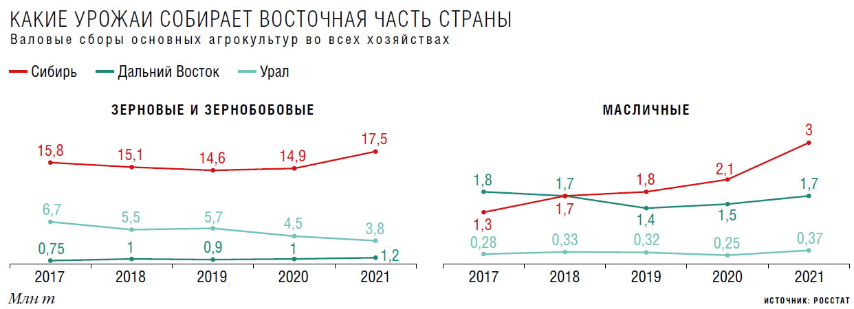 В благоприятные сезоны в Сибири можно выращивать около 15 млн т зерновых, из которых свободными для дополнительного экспорта из региона остается лишь 500 тыс. т, напоминает Миклухин. Остальное идет на внутреннее потребление и за пределы округа по отлаженным направлениям. «В текущих рыночных ценах на колосовые зерновые контрактные цифры аванса для НСЗК в 1,9 трлн руб. без реализованной концепции увеличения производства тянут для пшеницы из Сибири поставки на три сотни лет вперед», — подсчитал он.