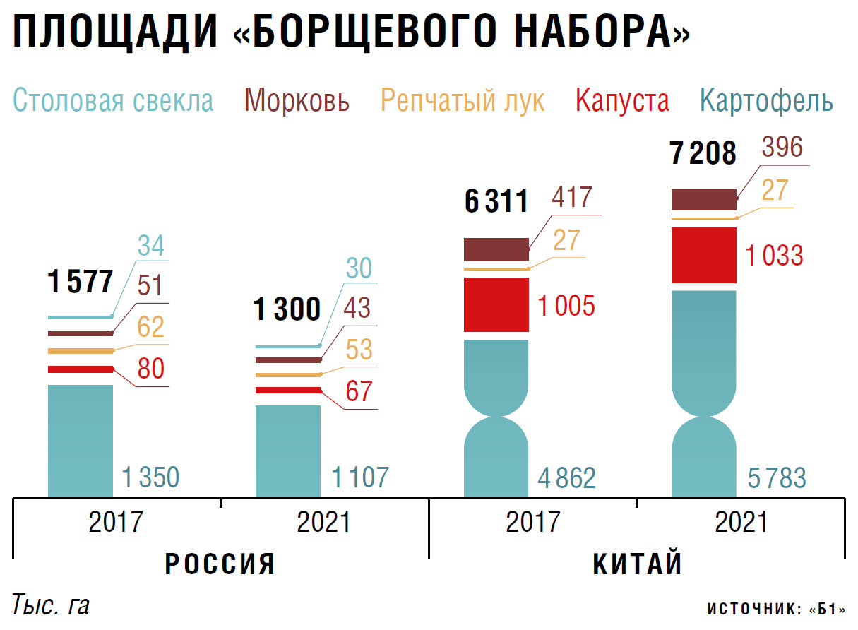 Один из важных трендов, который в последние годы наблюдается в китайском сельском хозяйстве, — активное расширение площадей под овощами, выращиваемыми в открытом грунте, и картофелем. В среднем их площади в КНР ежегодно растут на 3 %. Так, если в 2017-м хозяйства всех категорий республики выращивали данные агрокультуры примерно на 6,3 млн га, то к 2021-му — уже на 7,2 млн га, что больше российского показателя почти в пять раз (без учета столовой свеклы). Это увеличение в значительной мере было обусловлено расширением посадок картофеля, доля которого выросла с 77 до 80 % общей площади «борщевого набора», что объясняется повышением популярности данного продукта среди населения.