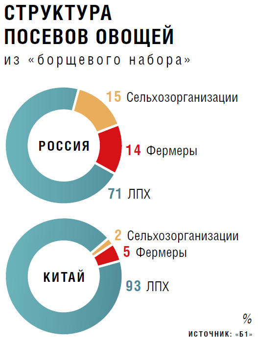Овощеводством в Китае в основном занимаются личные подсобные хозяйства (ЛПХ). В нашей стране этот сегмент тоже превалирует, однако в России доля ЛПХ составляет около 70 %, в Китае же превышает 90 %. Средний размер подсобных хозяйств в КНР — около 50 соток, что подчеркивает значимость семейных огородов и мелкого бизнеса в обеспечении продуктами питания.