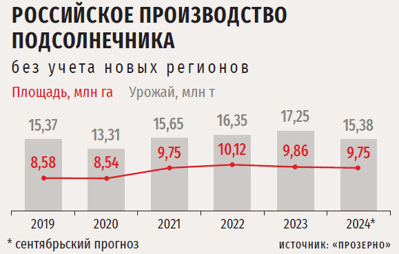 По сравнению с прошлым годом в 2024-м урожай основной масличной культуры существенно снизиться, полагает исполнительный директор Масложирового союза России (МЖСР) Михаил Мальцев. Его оценка на середину октября — 15,5 млн т (без новых регионов).