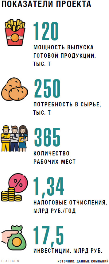Ежегодную потребность завода в сырье инвесторы оценивают в 250 тыс. т. Для переработки будут использовать картофель специально отобранных сортов, выращенный в том числе «Мираторгом». Уже в этом году агрохолдинг приступил к созданию семенного фонда данной агрокультуры на территории Калининградской и Брянской областей. Компания планирует инвестировать в семенной проект порядка 1 млрд руб. «Производство будет межрегиональным и предполагает вложения порядка 5,5 млрд руб. в закупку парка техники и строительство производственно-складских комплексов», — уточняет представитель «Мираторга».
