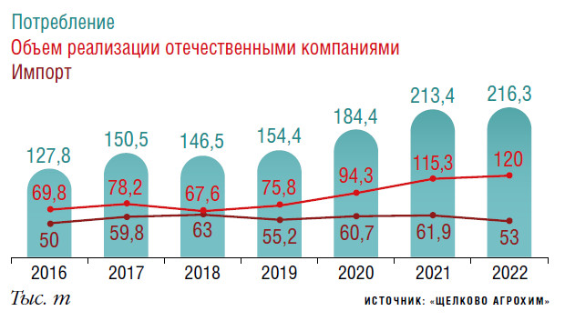 С началом специальной военной операции (СВО) некоторые зарубежные производители и поставщики СЗР стали приостанавливать отгрузки российским аграриям, а также повышать цены на химикаты даже в рамках оплаченных контрактов. Минсельхоз занялся мониторингом ситуации с целью выяснить возможности отечественных предприятий по замещению «проблемных» поставок. «В связи с СВО отдельные иностранные компании ушли с нашего рынка, и для нас это стало хорошей возможностью заместить их, — комментирует директор департамента продаж «Щелково Агрохим» Реваз Кавтарадзе. — Нехватки производственных мощностей у отечественных игроков нет, и введенные санкции дали нам возможность показать, что мы спокойно можем возмещать все выпадающие объемы СЗР». «Щелково Агрохим» закладывает ежегодный рост производства агрохимикатов на 15–20 %, а на 2023-й запланировано увеличение сразу на 30 %.