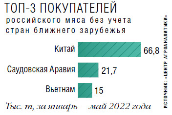 Пять ведущих стран — импортеров российской продукции животноводства занимают долю в 72 % от общего объема поставок из нашей страны. Среди них — Китай, Саудовская Аравия, Беларусь, Казахстан и Вьетнам (см. график на стр. 37). «Сейчас происходит укрепление позиций России на ранее открытых рынках, так как объемы импорта наших ключевых покупателей по-прежнему высоки, — комментирует Кравченко. — Так, например, Саудовская Аравия ежегодно наращивает темпы ввоза из нашей страны, особенно мяса птицы, которого она закупает порядка 80 % от общего объема приобретаемой у нас продукции животноводства».
