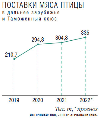 Согласно данным Национального союза птицеводов (НСП), в первом квартале 2022 года экспорт птицеводческой продукции вырос в натуральном выражении в полтора раза, а в стоимостном — более чем в два раза относительно аналогичного периода 2021-го. В апреле и мае рост продолжился, хоть и не такими высокими темпами.